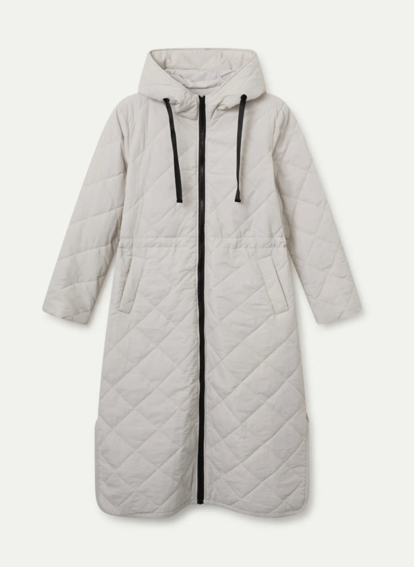 Abrigo con tejido acolchado de color blanco. Cuello alto con capucha ajustable y manga larga terminada en puño elástico. Cierre frontal con cremallera. Hombro ligeramente caído. Bolsillos laterales. Forro interior. La modelo mide 177 cm y lleva la talla S.
