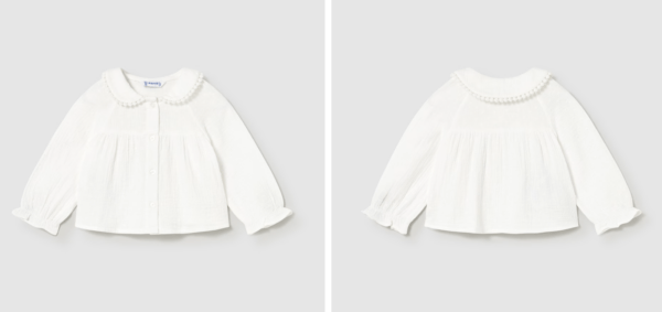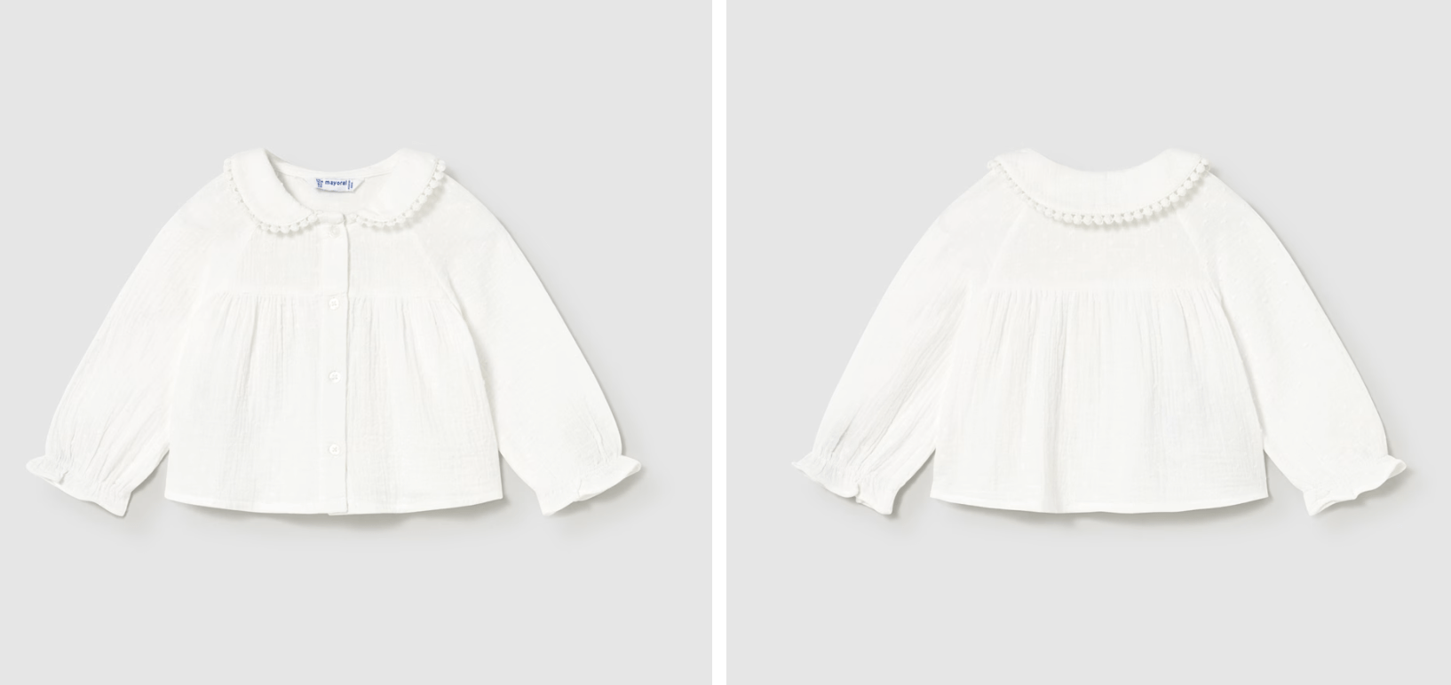 Blusa de manga larga para bebé con puños elásticos. Cuello bebé. Cierre con botones en la parte delantera. Tejido 100% algodón.