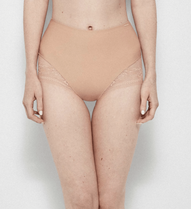 Braguita alta con acabados sin costuras que evitan marcas. Tejido laminado que se adapta al cuerpo como una segunda piel con efecto envolvente. Encaje extraplano muy delicado y femenino con trasero efecto tanga.