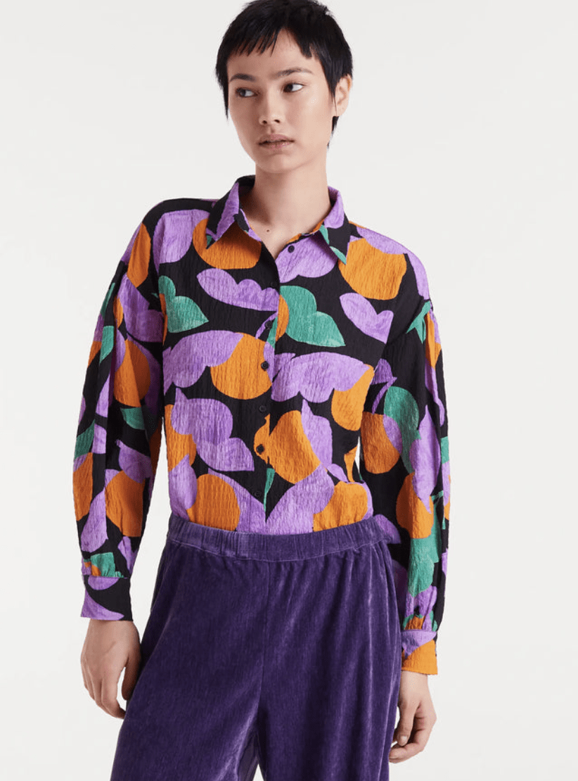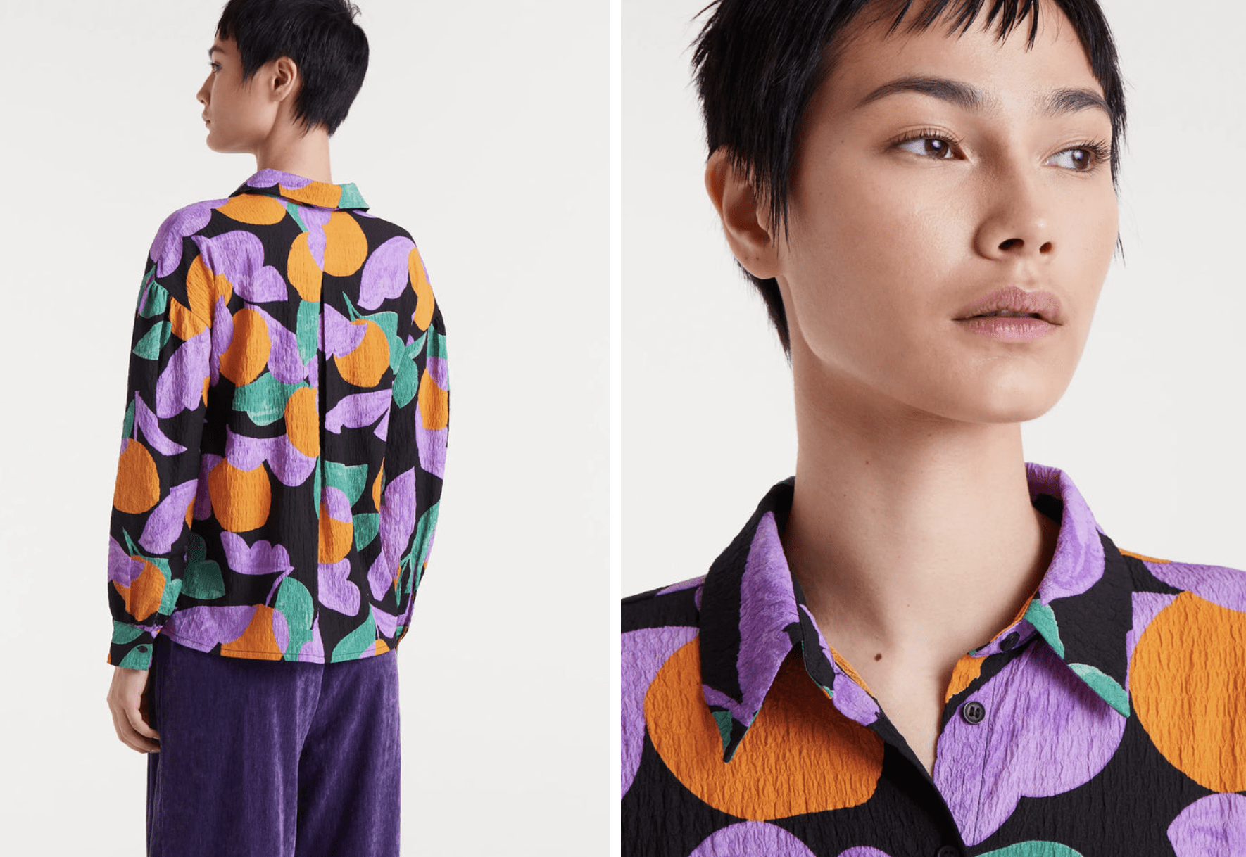 Camisa de tejido seersucker con estampado Apricot. Cuello solapa y manga larga terminada en puño con botón. Cierre frontal con botones. Hombro ligeramente caído. La modelo mide 177 cm y lleva la talla S.