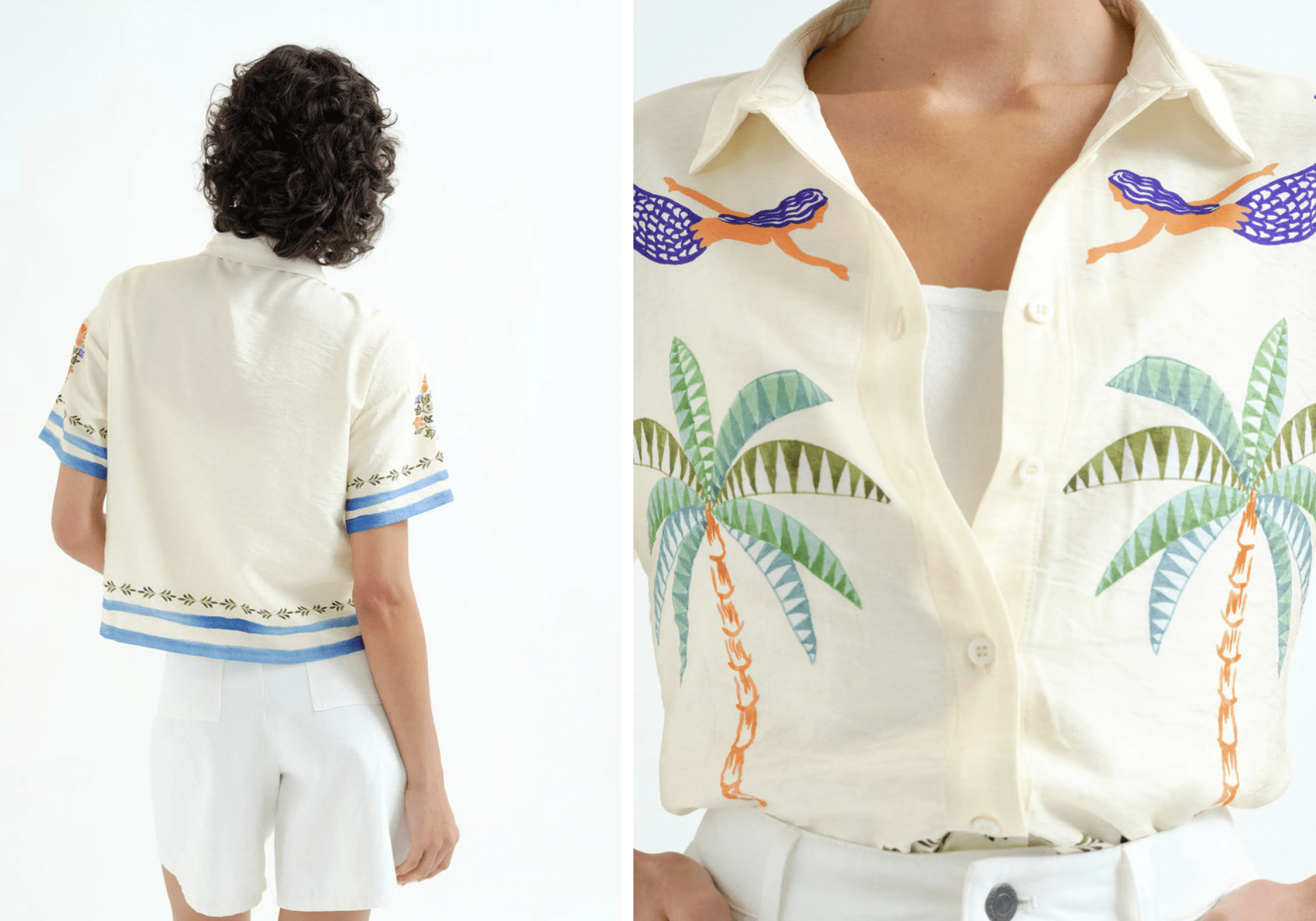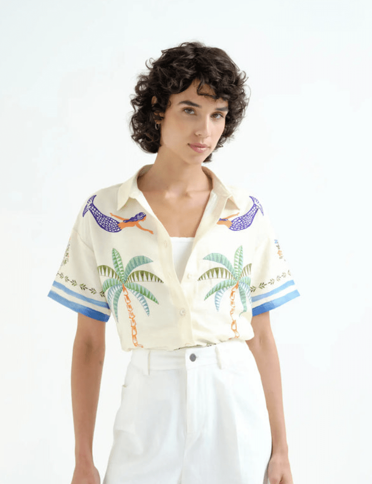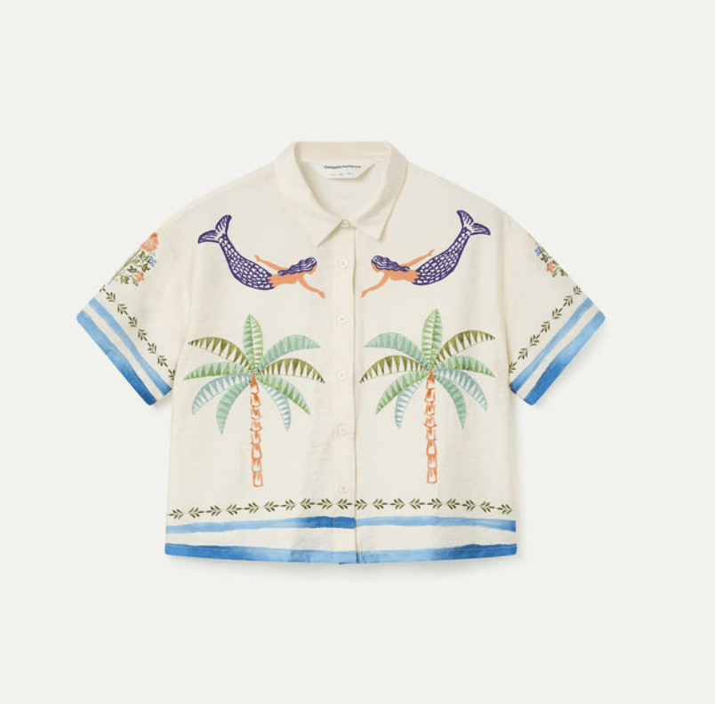 Camisa de tejido crepé con estampado palm & mermaid. Cuello con solapa y manga corta. Hombro ligeramente caído. Cierre frontal con botones de color blanco. La modelo mide 175 cm y lleva la talla S.