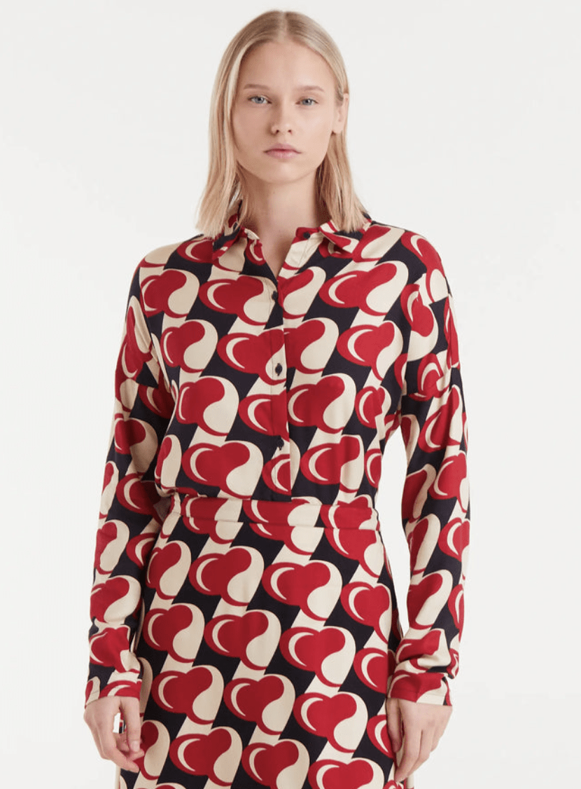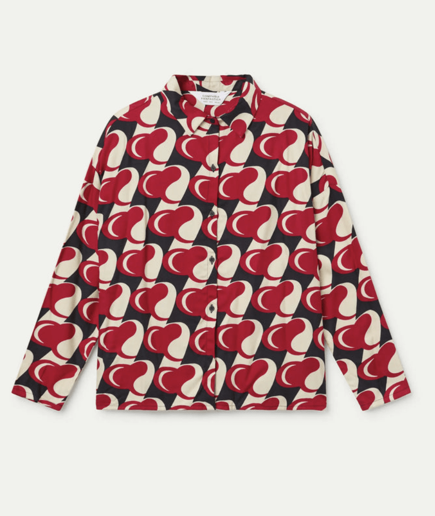 Camisa con tejido viscosa twill con estampado Heart Attack. Cuello con solapa y manga larga.Cierre frontal con botones. Hombro ligeramente caído. La modelo mide 174 cm y lleva la talla S.