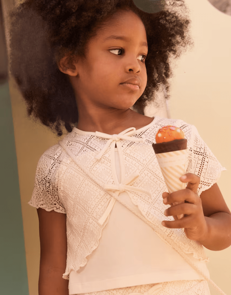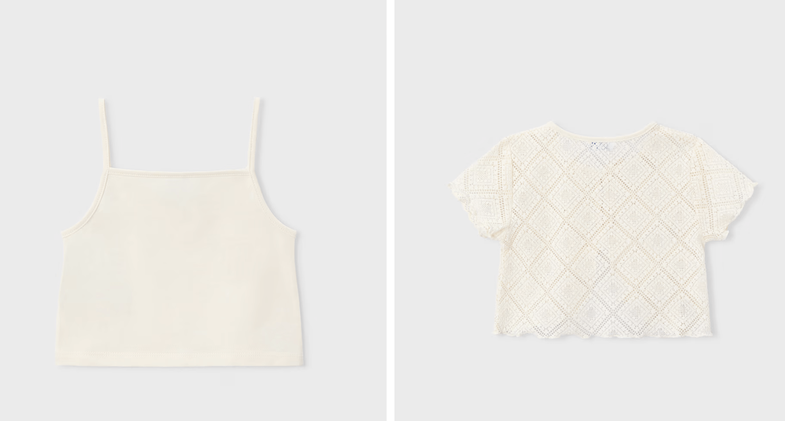 Contiene poliéster reciclado. Camiseta de crochet de dos piezas para niña. Cuello redondo. Manga corta. Diseño compuesto por una camiseta exterior de crochet con lazos decorativos en el delantero y un top de tirantes a juego. Bajo y mangas con acabado ondulado. Disponible en la talla desde los 2 a los 10 años.