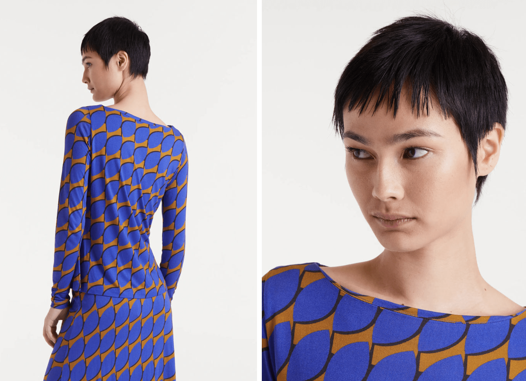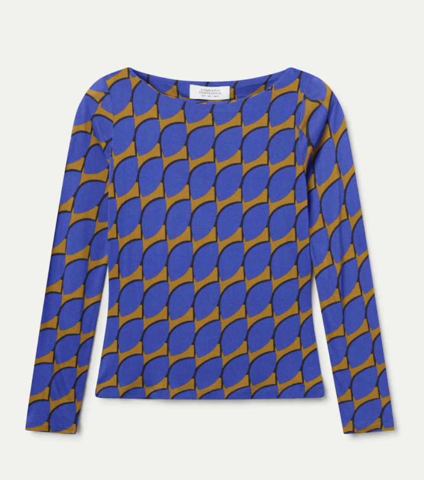 Camiseta con estampado Skouros Small. Tejido jersey viscoso. Cuello barco y manga larga. La modelo mide 177 cm y lleva la talla S.
