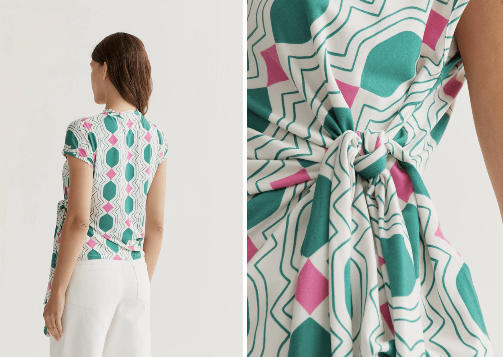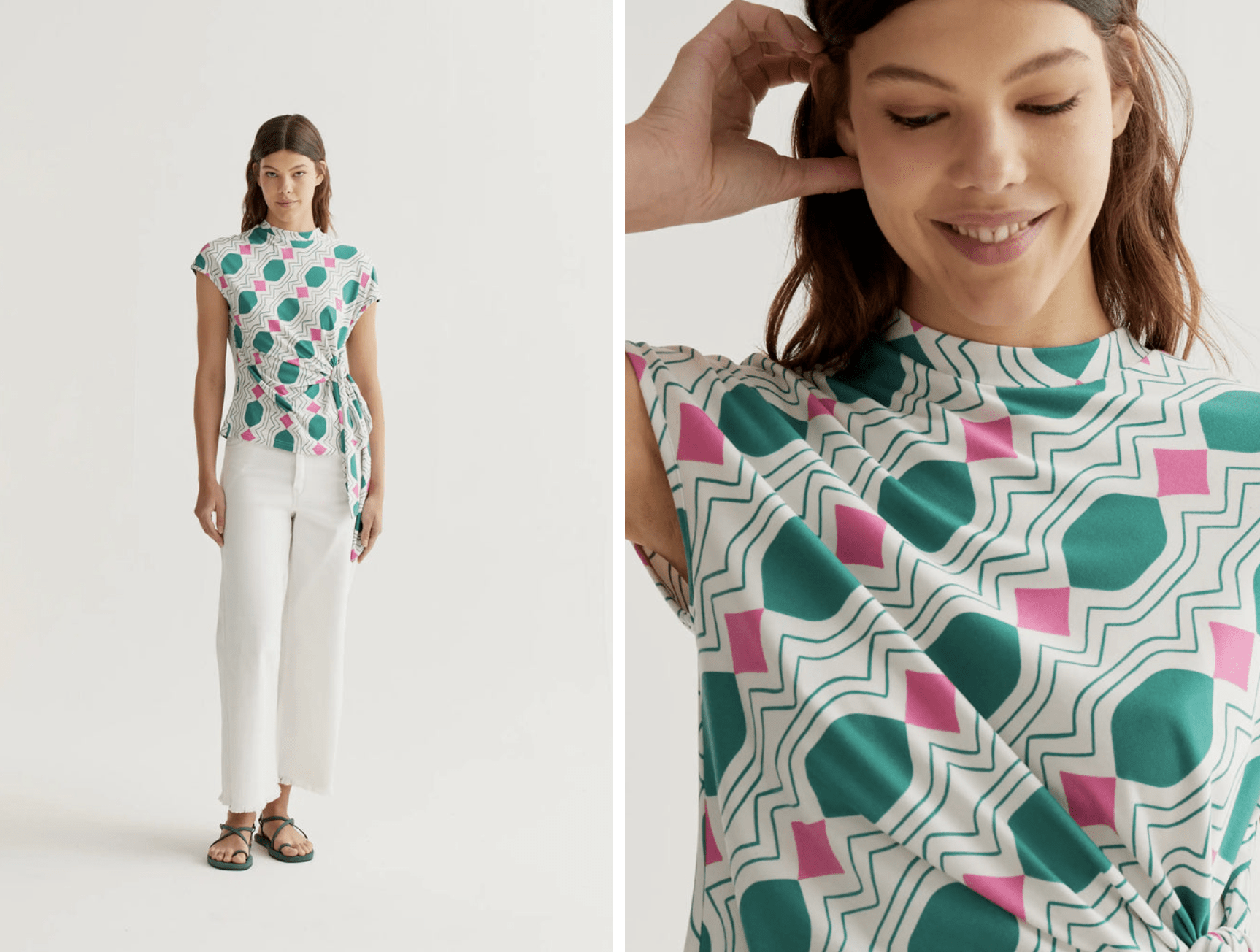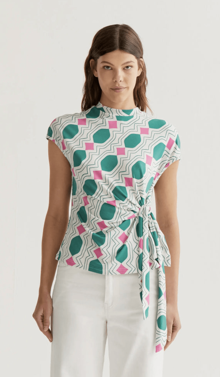 Camiseta con tejido jersey con estampado geometric. Cuello perkins y sin mangas. Detalle lazado en cintura. La modelo mide 177 cm y lleva la talla S.