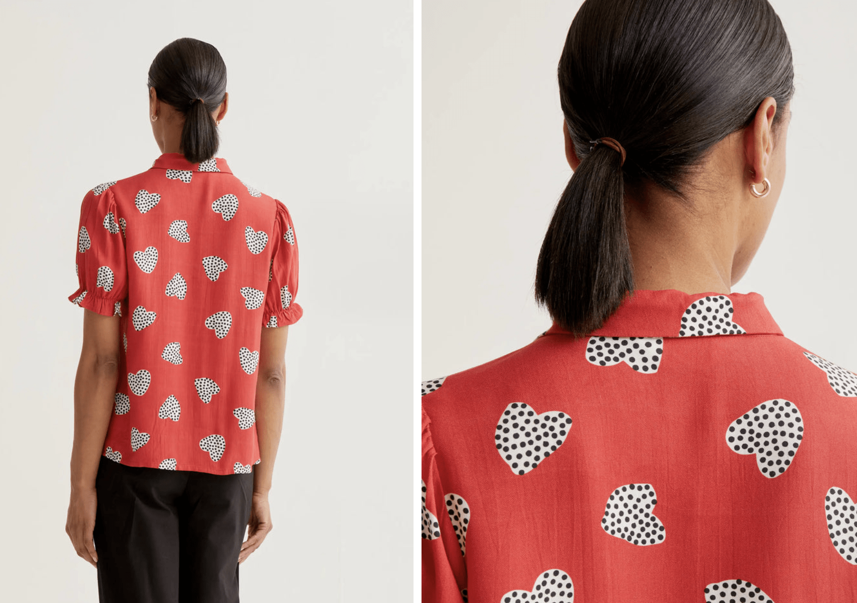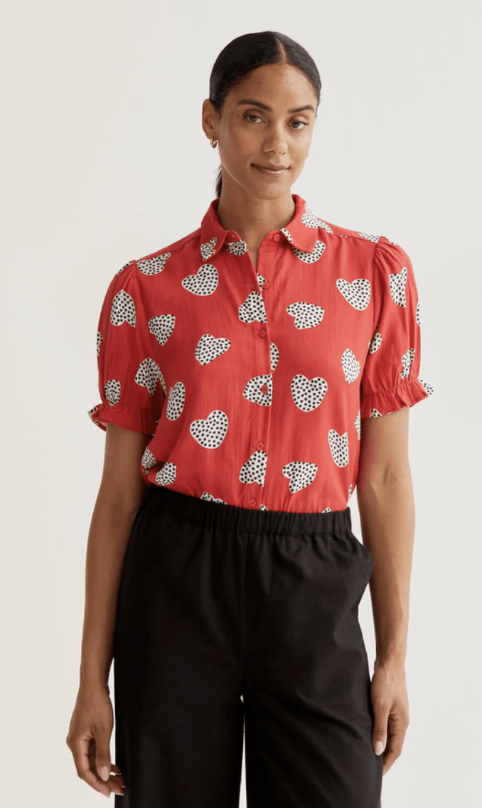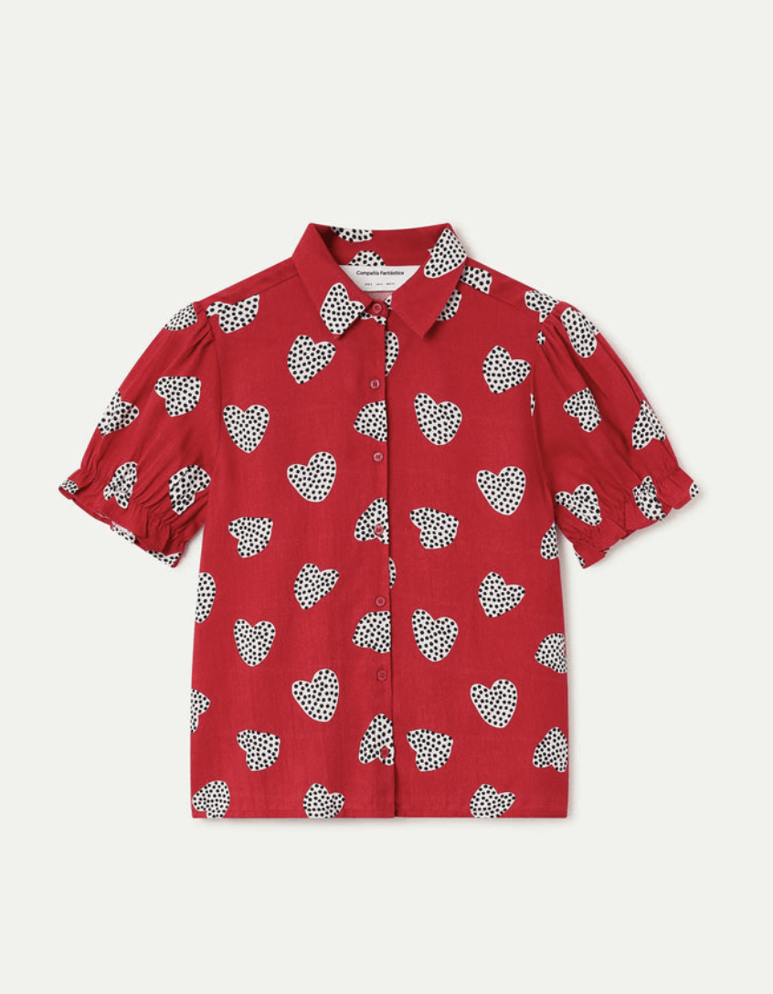 Camisa con estampado harmony red. Cuello con solapa y manga corta ligeramente abullonada con detalle de volantes. Cierre frontal con botones de color rojo. La modelo mide 173 cm y lleva la talla S.