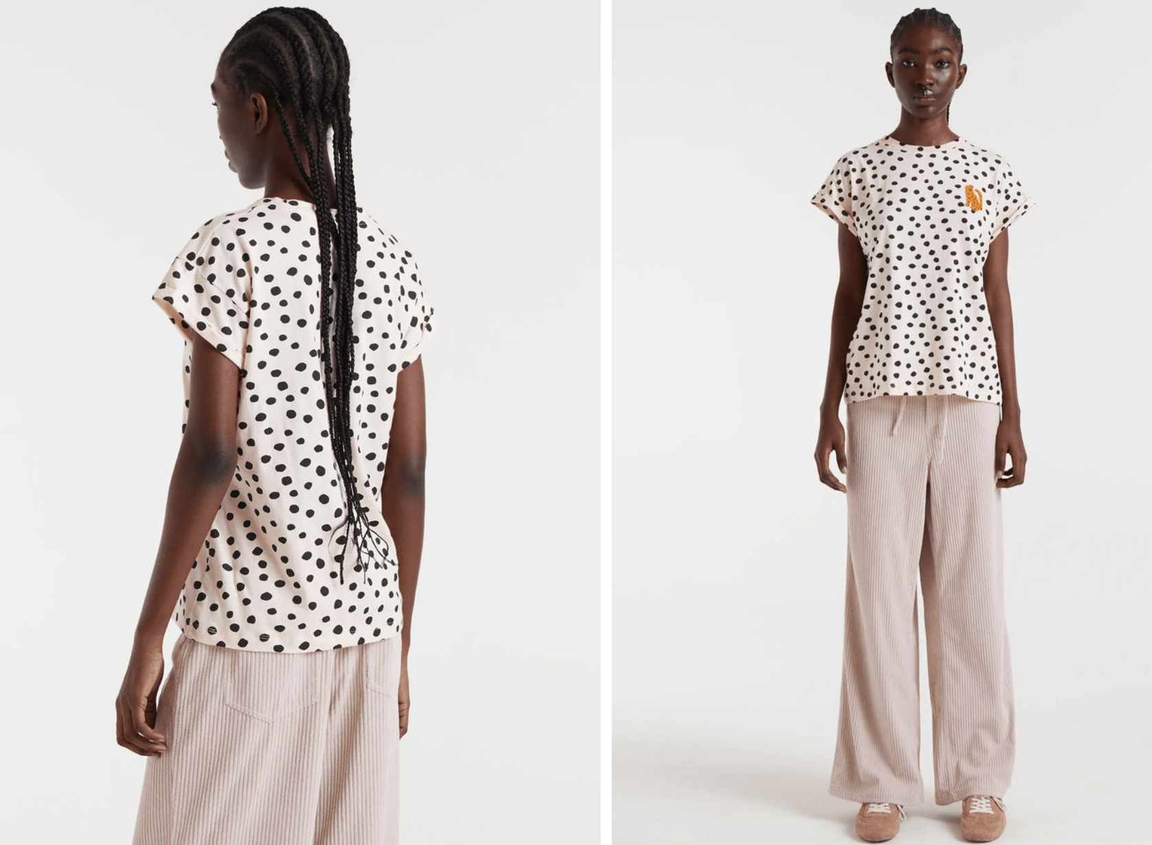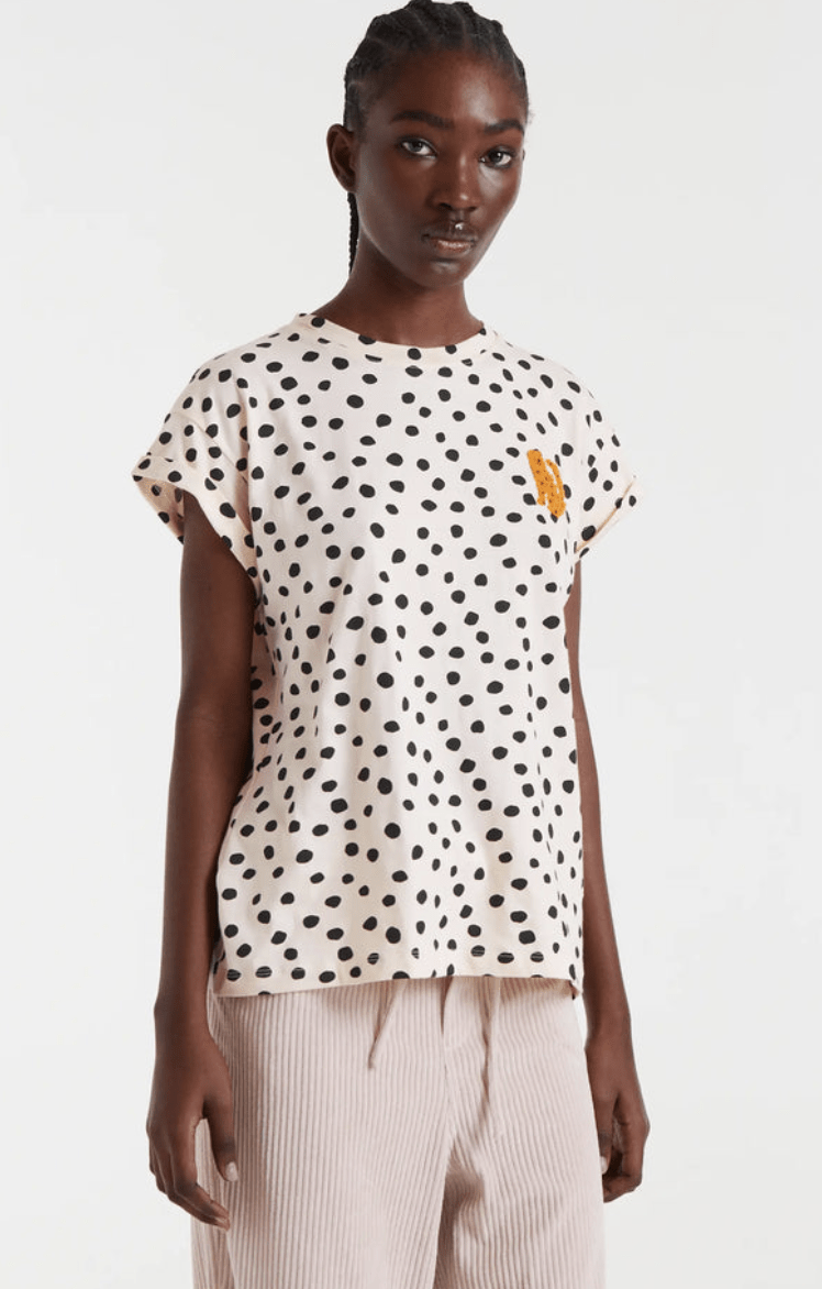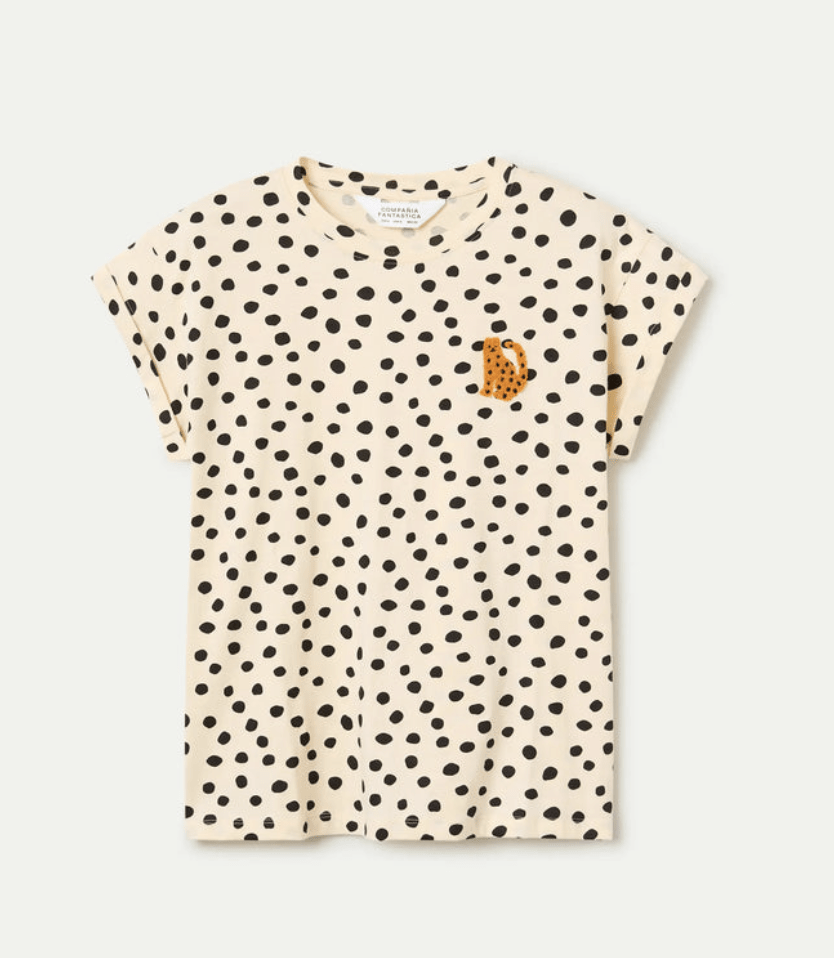 Camiseta tejido 100% algodón con estampado Tano Dots. Cuello redondo y maga corta. La modelo mide 178 cm y lleva la talla S.