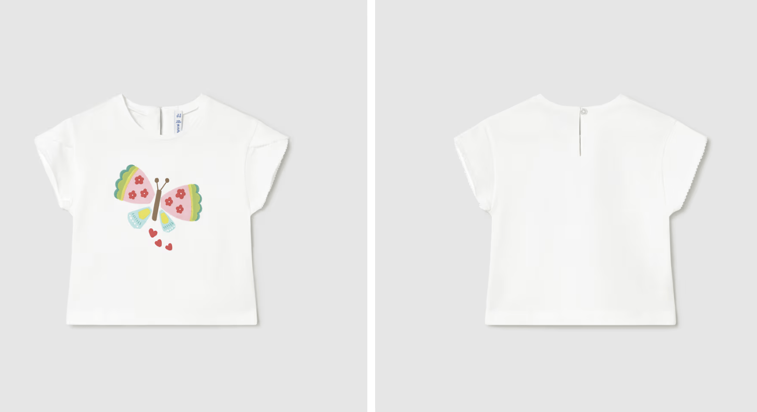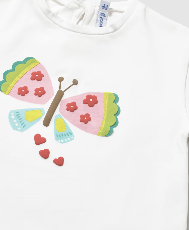 Camiseta para bebé. Confeccionada en algodón, cuenta con manga corta y cuello redondo. Incorpora un cierre con botón en la parte posterior. Gráfica posicionada. Detalle de volantes en los bordes de las mangas.