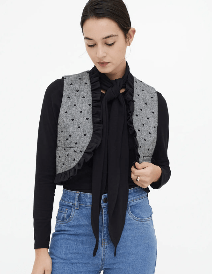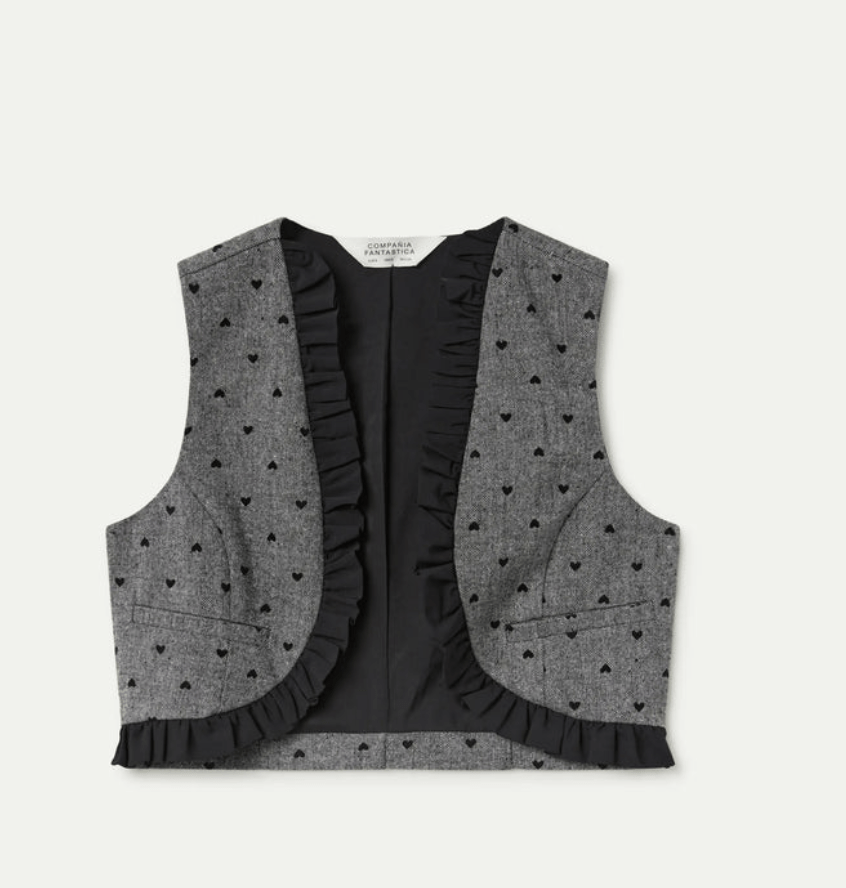 Chaleco de tejido tweed con estampado de corazones de color negro. Diseño abierto con volantes. Forro interior. La modelo mide 177 cm y lleva la talla S.