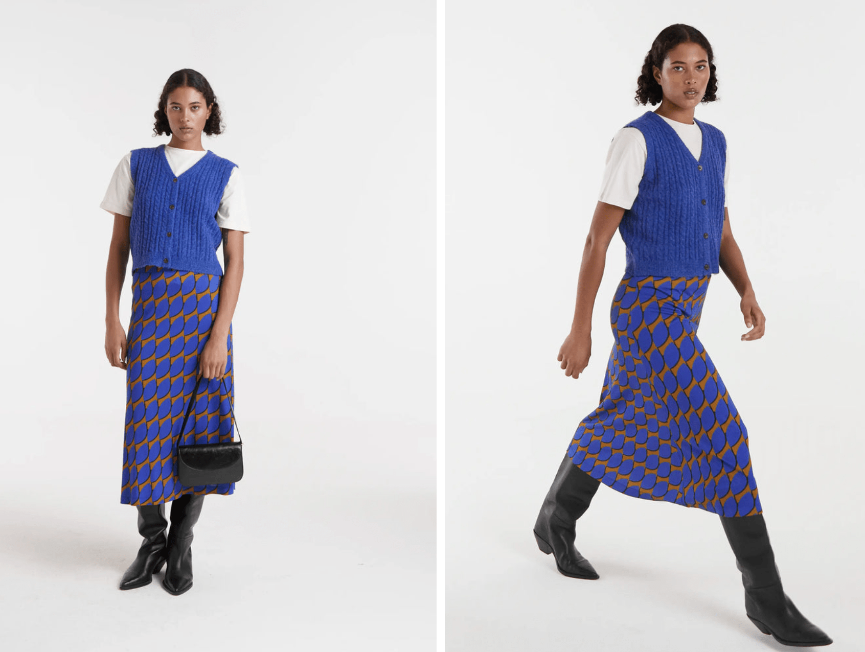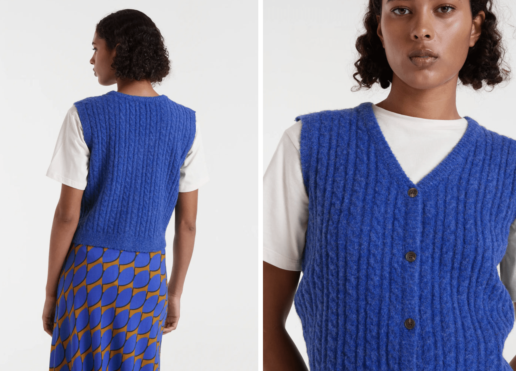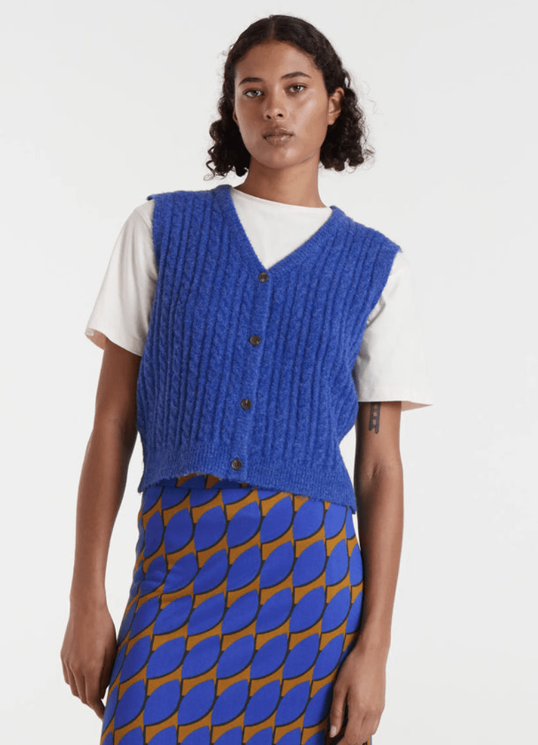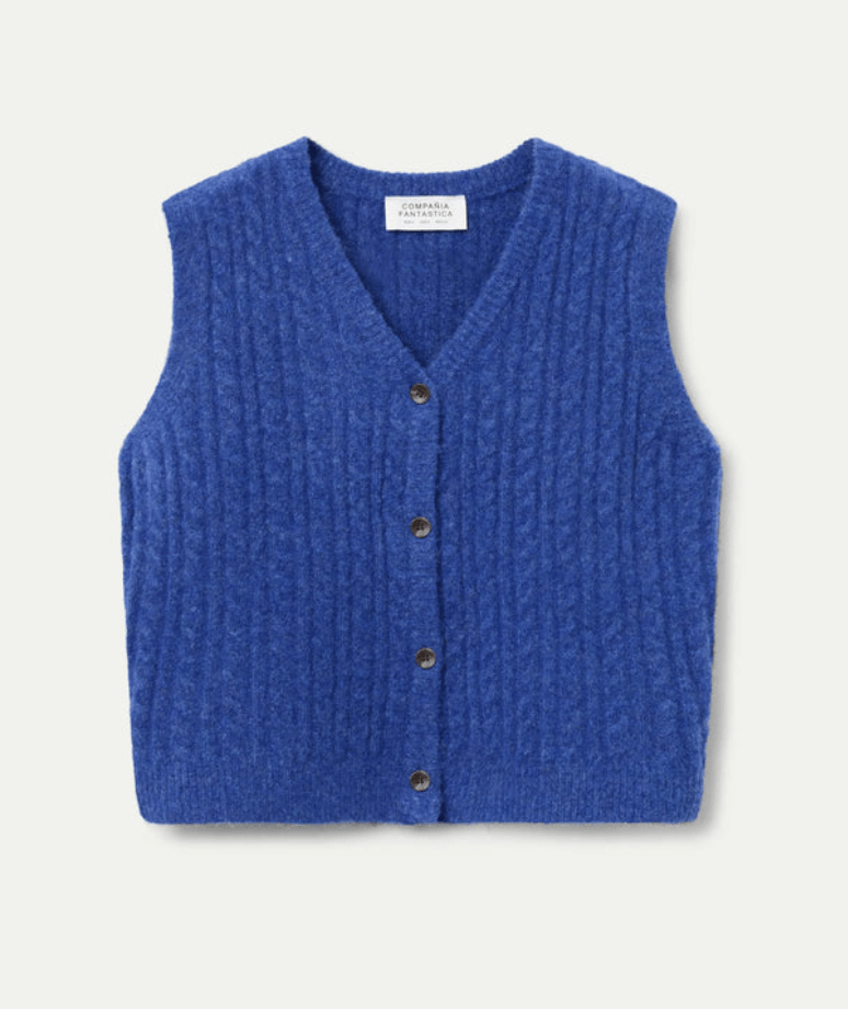 Chaleco de punto de color azul. Con cuello pico y sin mangas. Cierre frontal con botones. Detalles en rib. La modelo mide 178 cm y lleva la talla S.