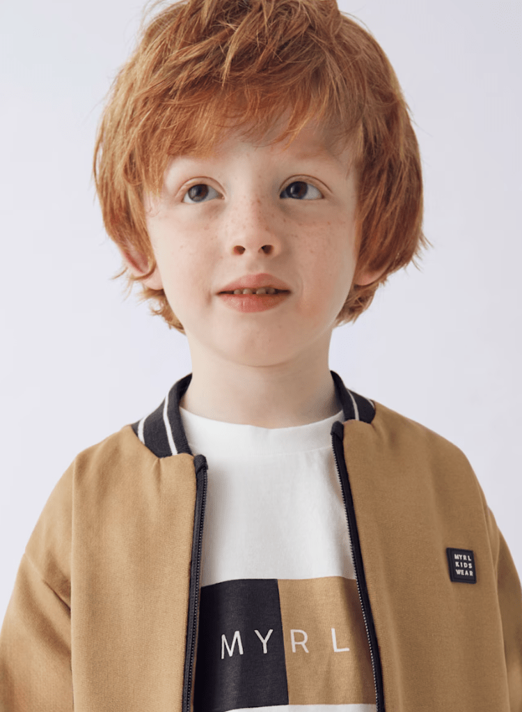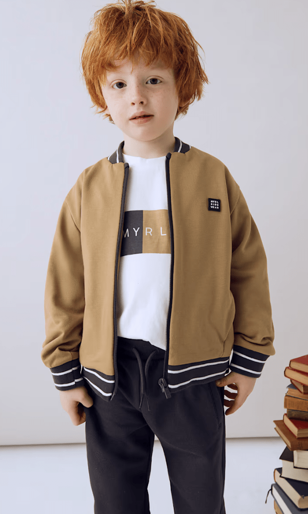 Sudadera de manga larga para niño. Cuello bomber. Cierre central delantero con cremallera.