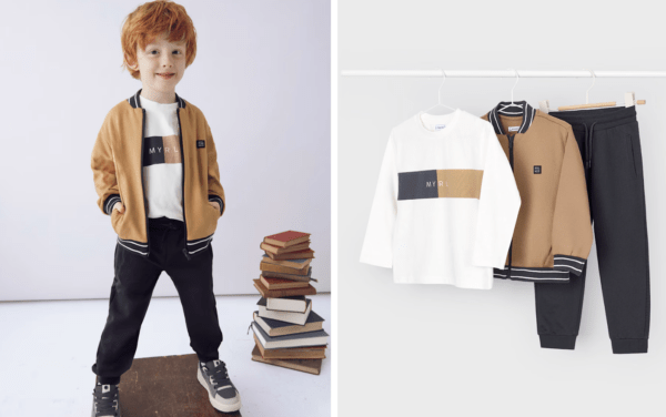 Chándal de tres piezas para niño compuesto por una sudadera, un pantalón largo deportivo y una camiseta a juego.