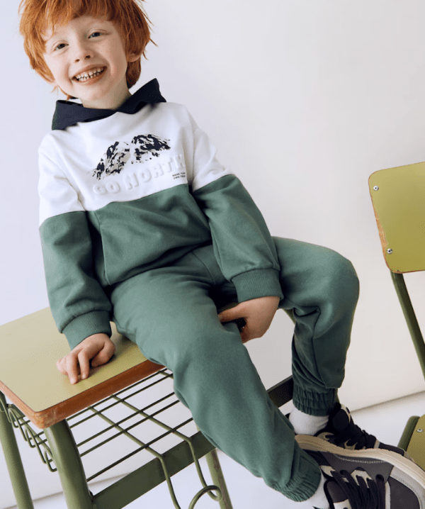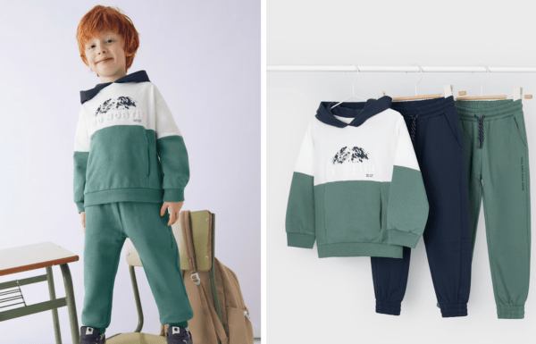 Chándal de tres piezas para niño compuesto por una sudadera y dos pantalones largos deportivos.