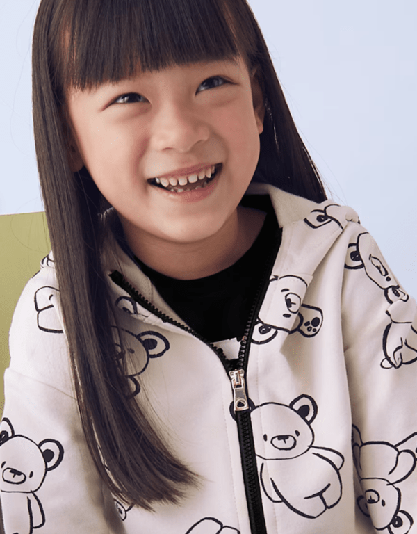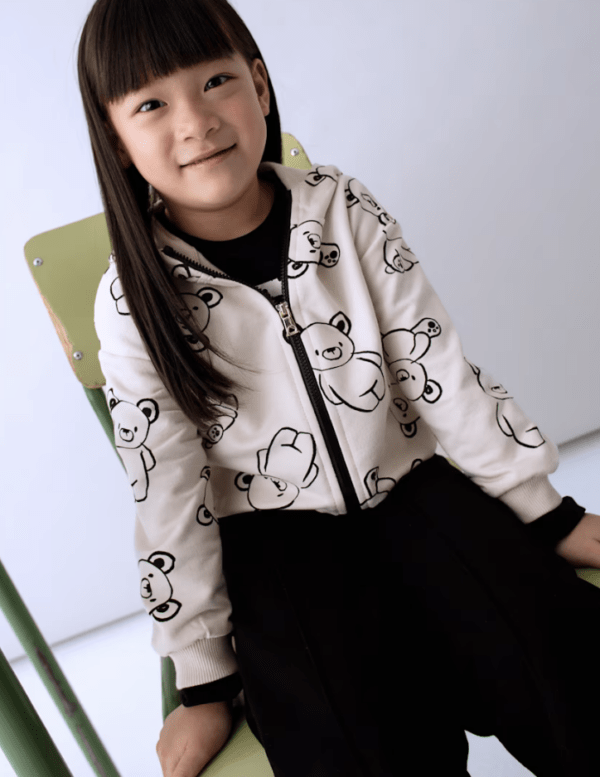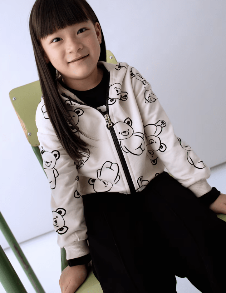 Sudadera de manga larga para niña. Cuello con capucha. Cierre central delantero con cremallera. Diseño con cordón regulable en el bajo para un mejor ajuste al cuerpo. Elementos de adorno: serigrafía (print).