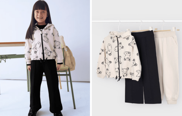 Chándal de tres piezas para niña compuesto por una sudadera y dos pantalones largos deportivos.