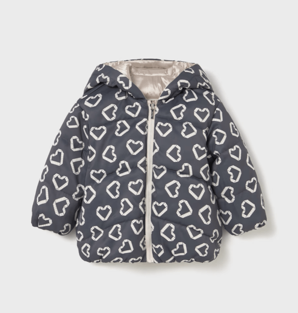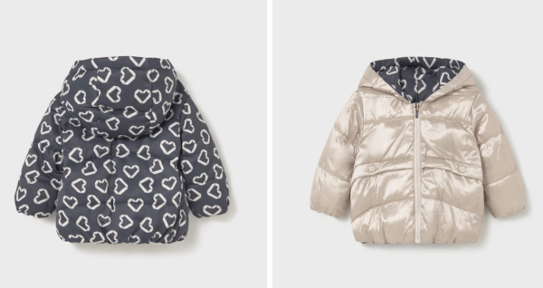 Contiene poliéster reciclado. Chaquetón de manga larga para bebé con puños elásticos. Cuello con capucha. Cierre central delantero con cremallera. Exterior textil con efecto acolchado. Bolsillos funcionales en la parte delantera. Este modelo presenta un diseño reversible.