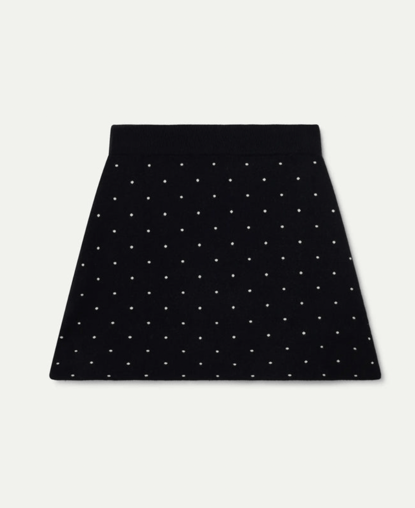 Falda corta punto jacquard con estampado mini black. Con cintura elástica y tiro medio. La modelo mide 178 cm y lleva la tasa S.