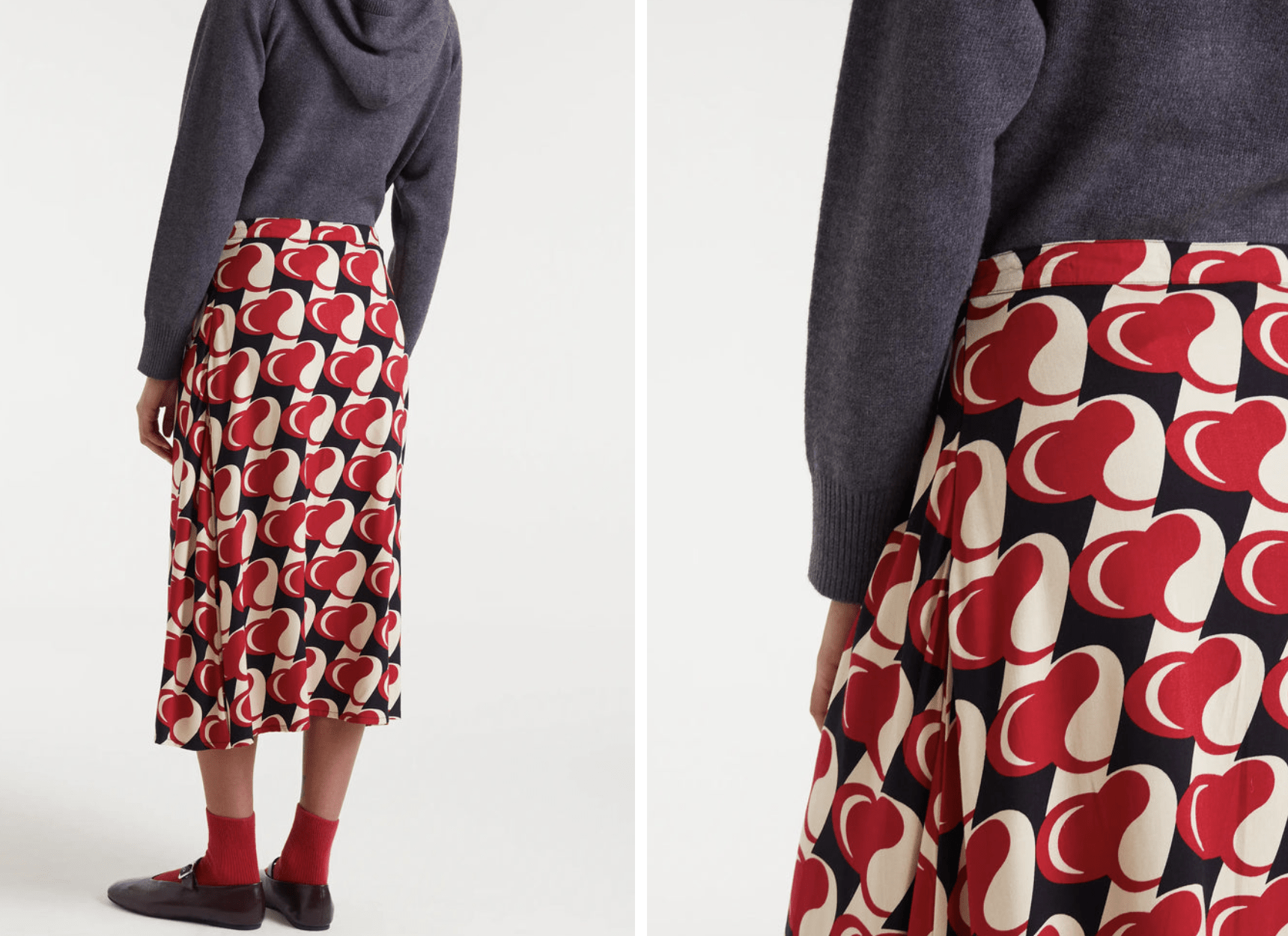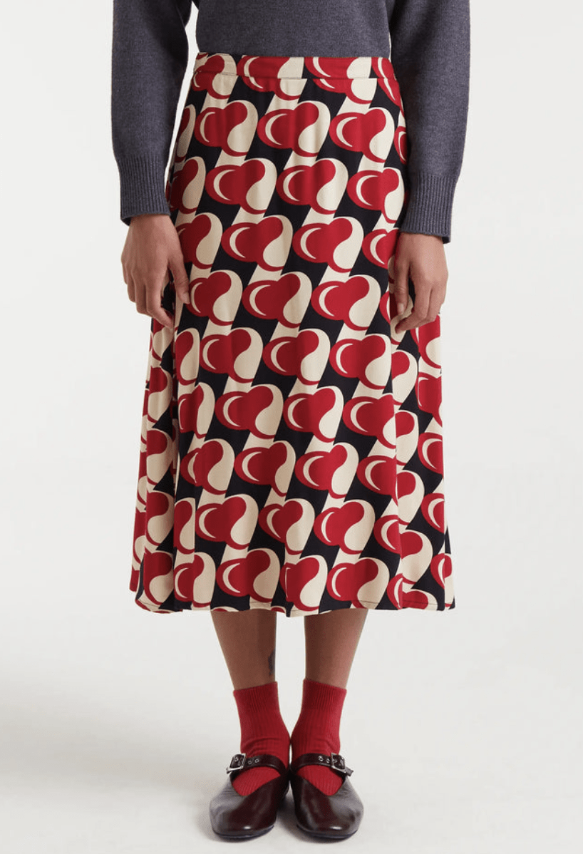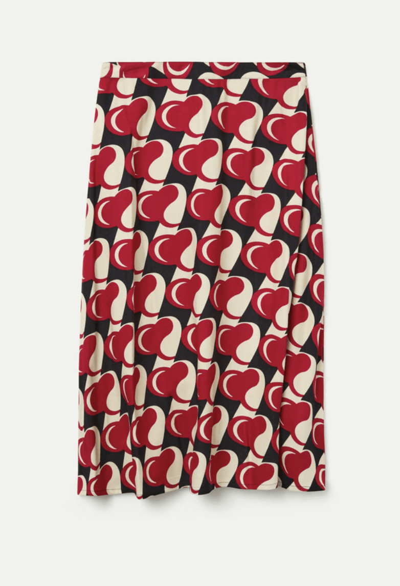 Falda midi de tejido viscosa twill con estampado Heart Attack. Cintura fija de tiro alto con cremallera invisible lateral. La modelo mide 178 cm y lleva la talla S.