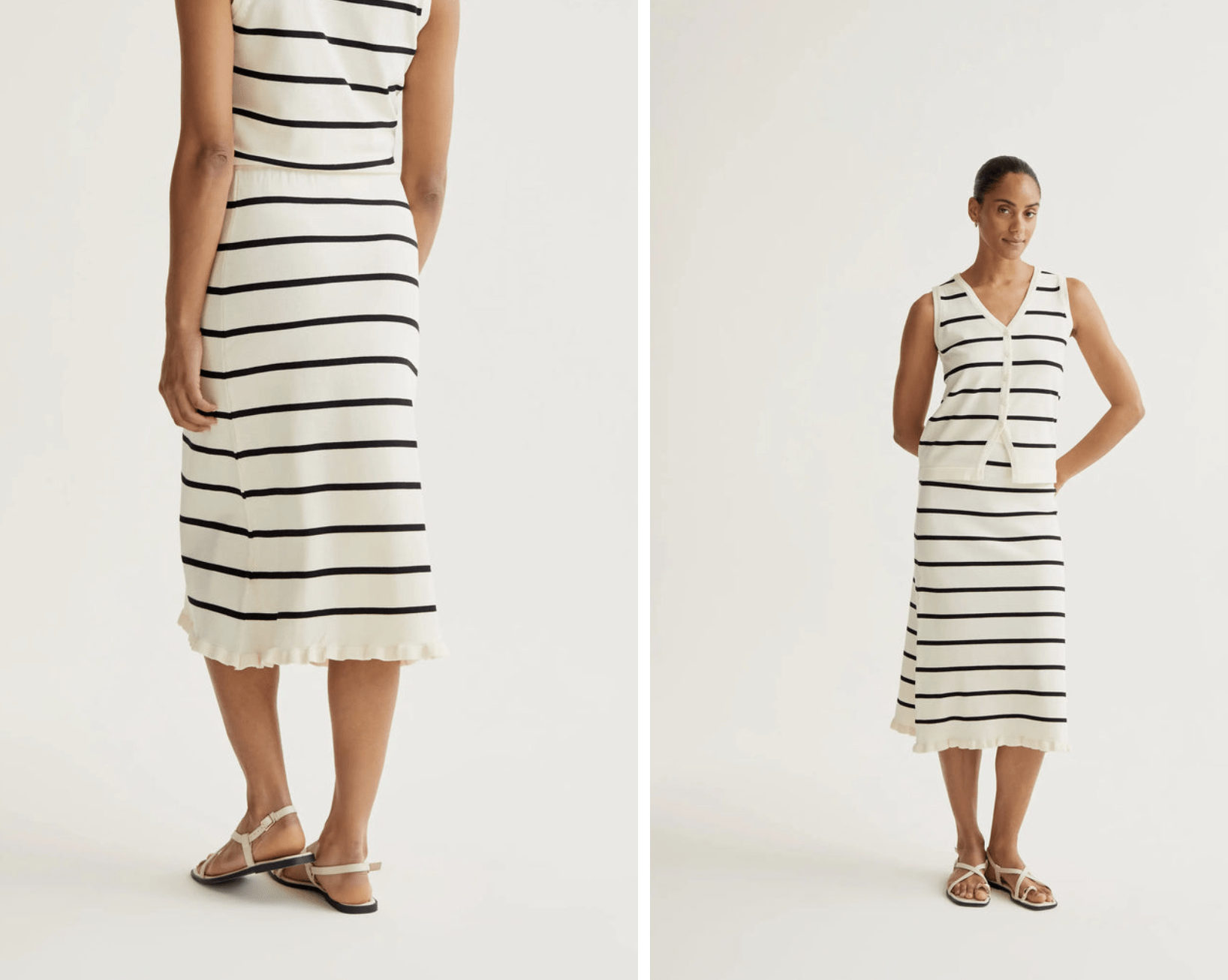 Falda midi con tejido de punto estampado de rayas de color blanco y negro. Citura fija elástica de tiro alto. Detalle de volantes y acabados en rib. La modelo mide 173 cm y lleva la talla S.