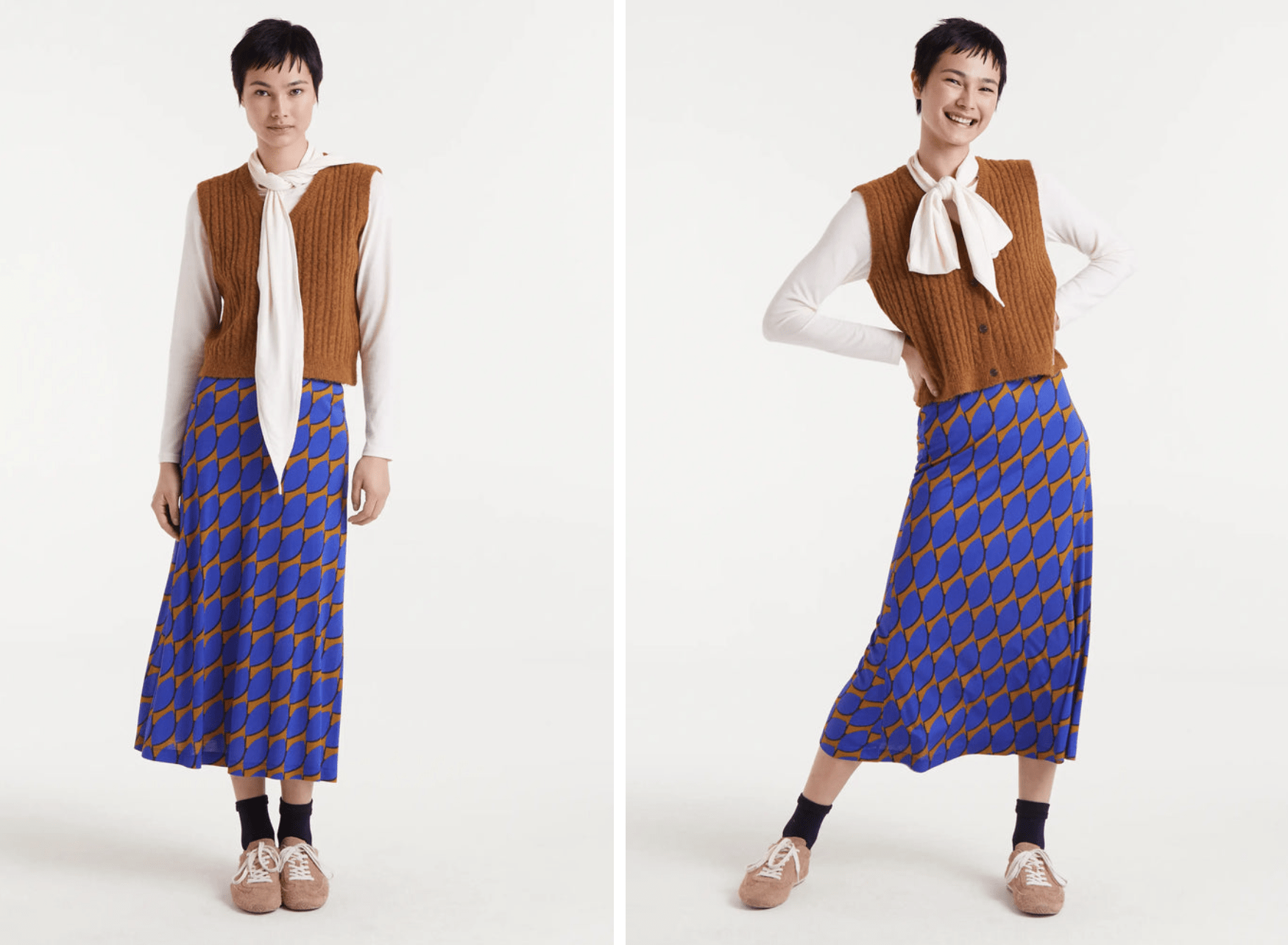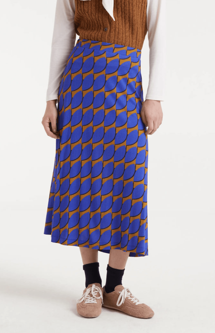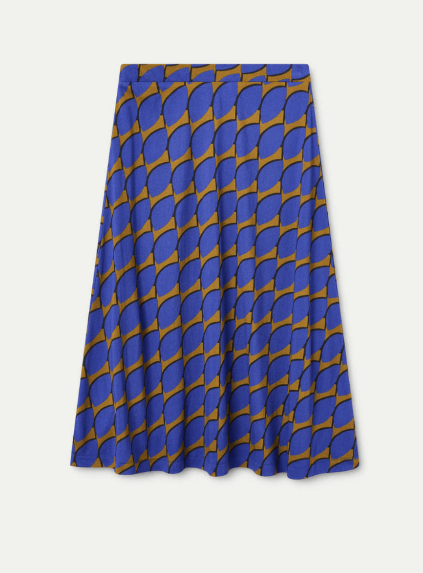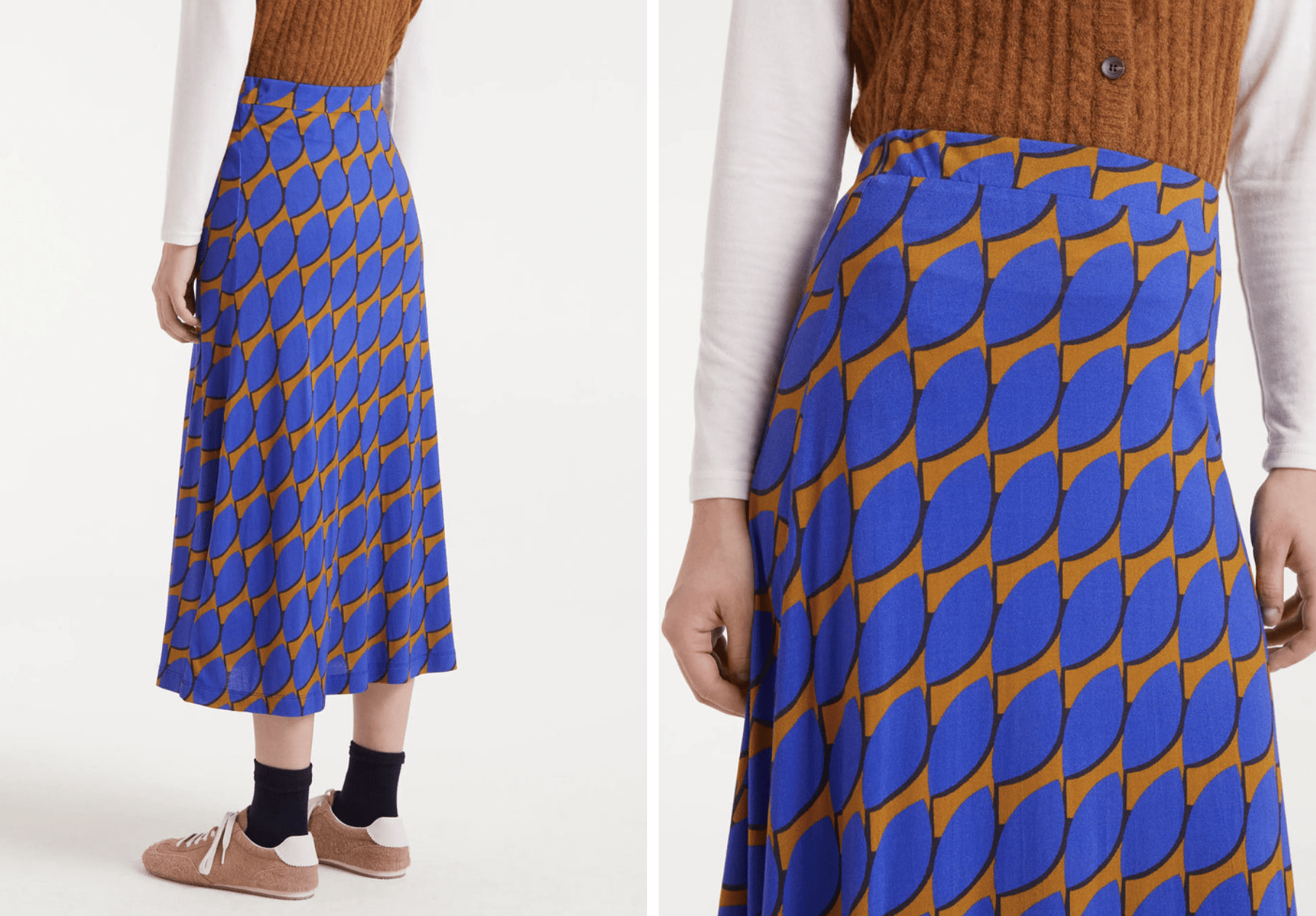Falda Midi con estampado Skouros Small. Tejido jersey viscoso. Cintura fija alta con goma elástica. La modelo mide 177 cm y lleva la talla S.
