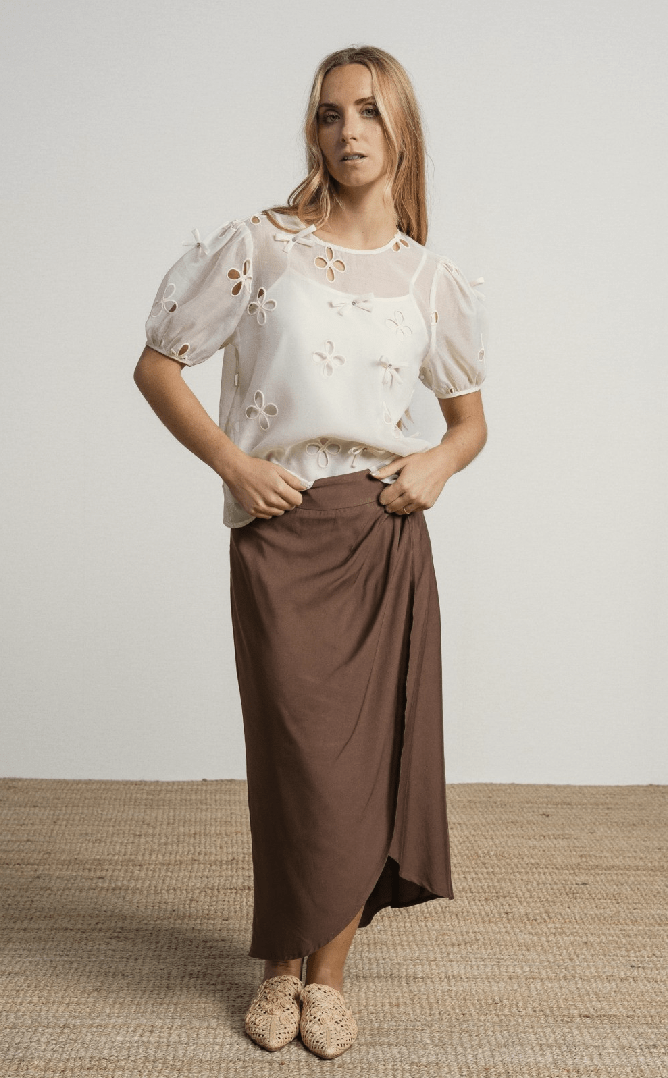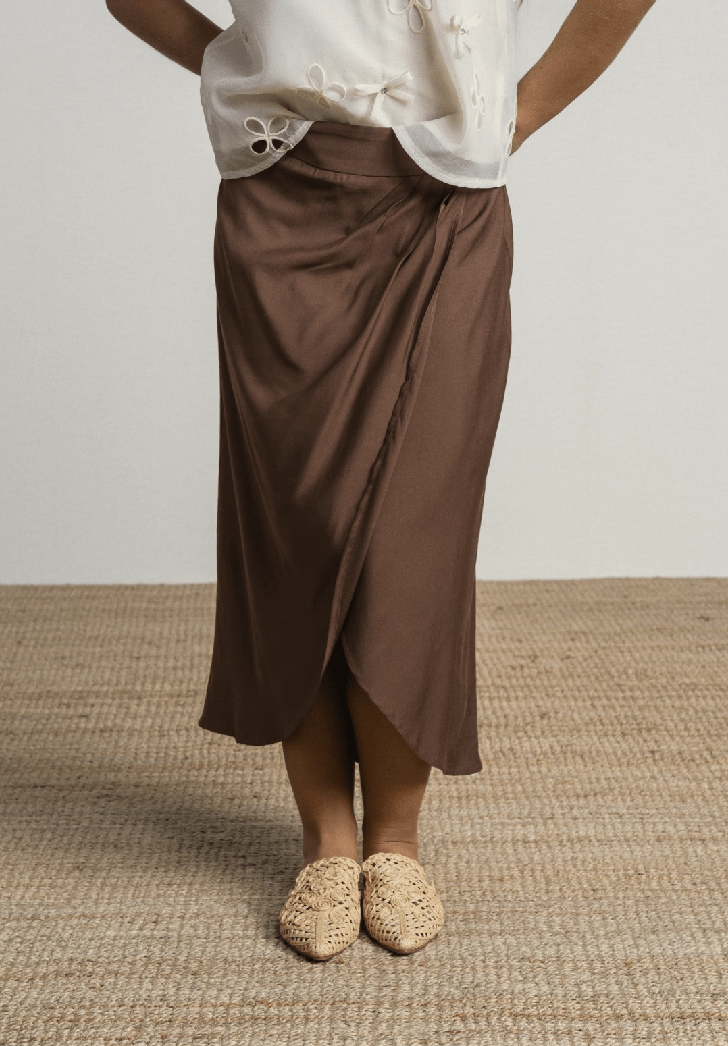 Falda midi fluida de tejido satinado. Estilo cruzado con detalle de abertura frontal.