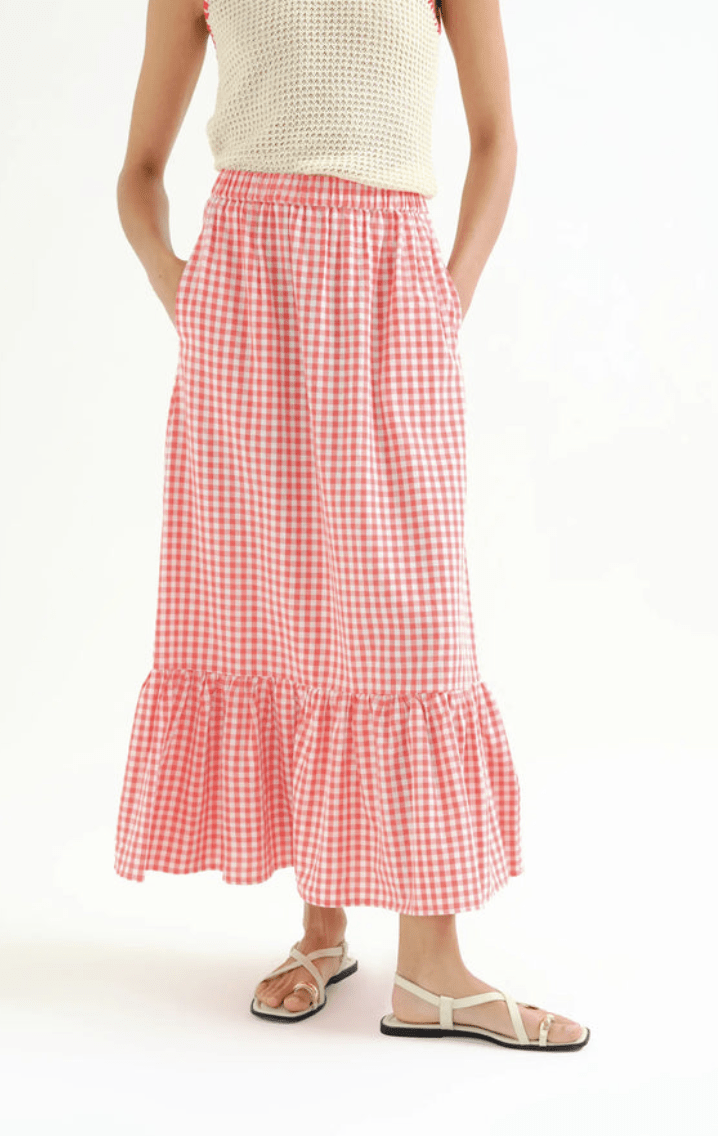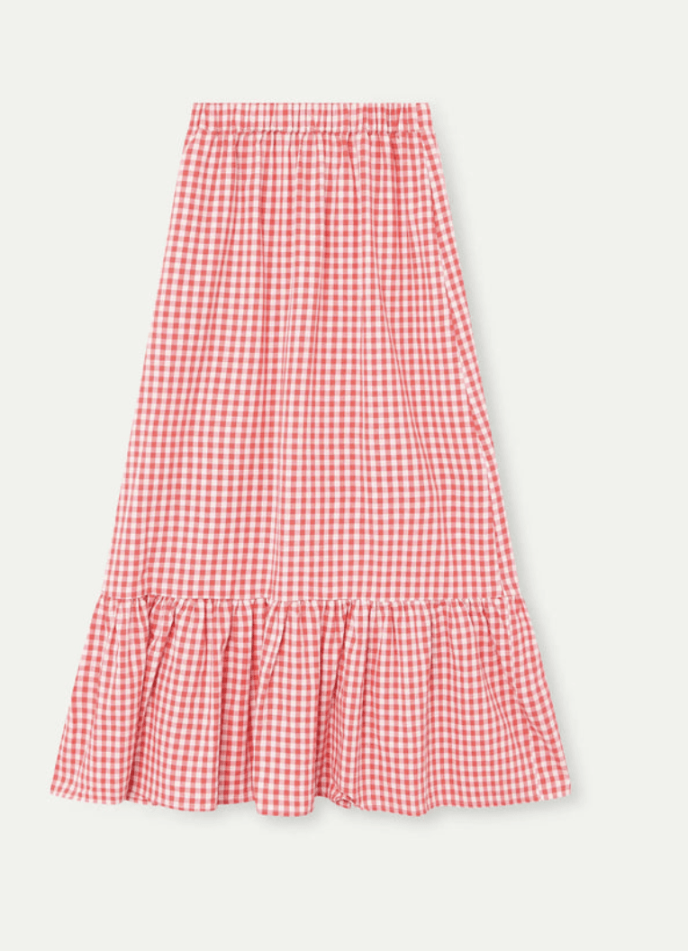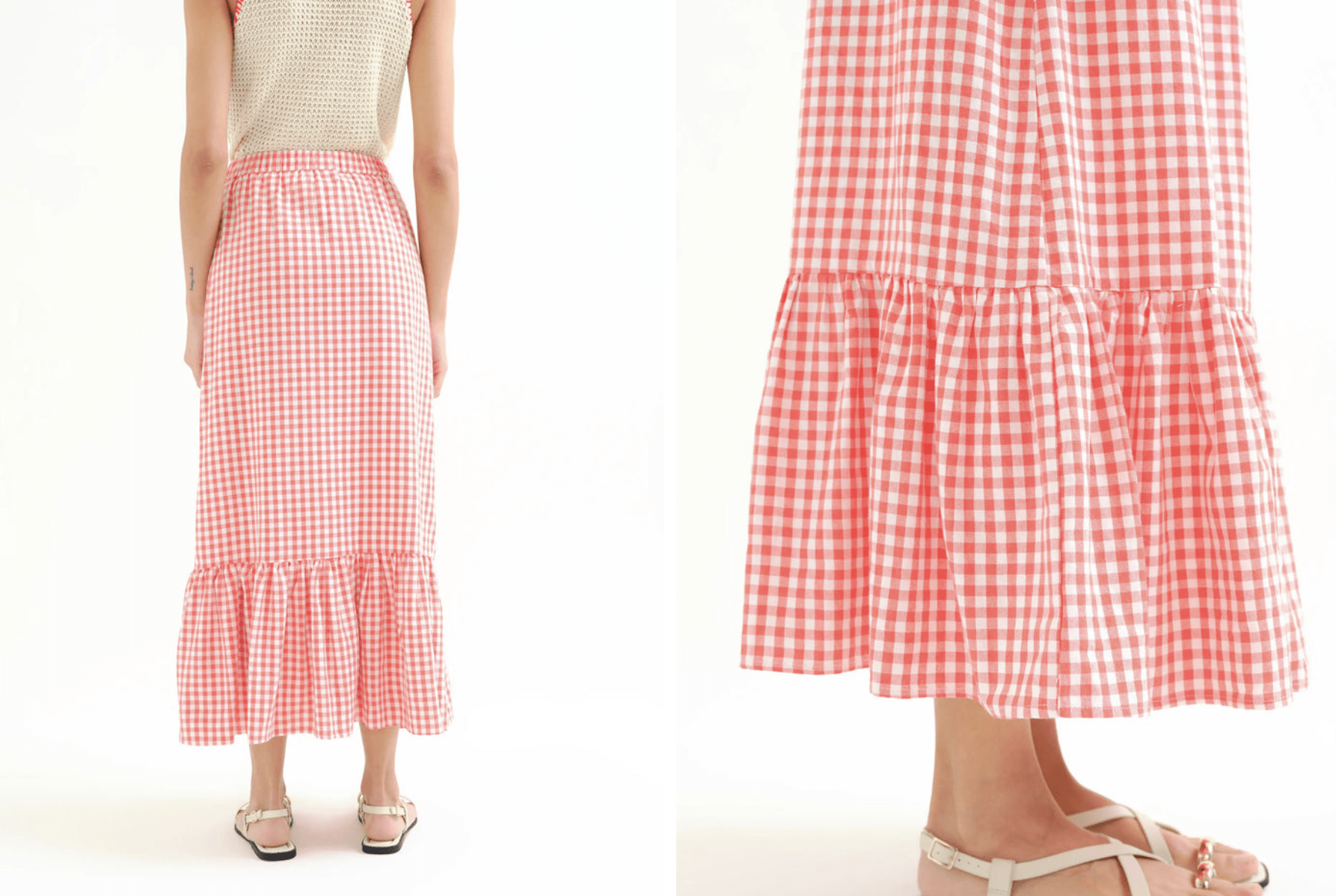Falda de tejido 100% algodón vichy de color rojo. Cintura elástica de tiro alto. Falda con volante. Bolsillos laterales. La modelo mide 175 cm y lleva la talla S.