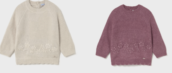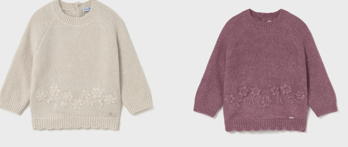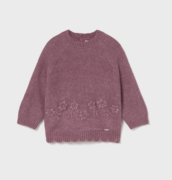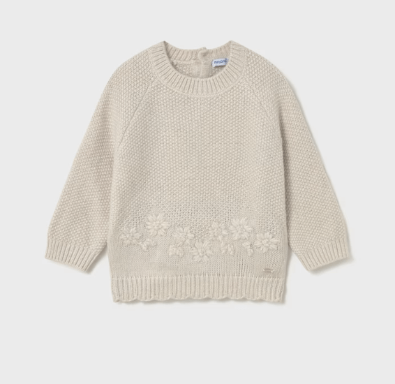 Jersey de manga larga para bebé. Cuello redondo. Cierre con botones en la espalda para facilitar la puesta de la prenda. Confección combinada en distintos tejidos para conseguir un diseño único y especial. Elementos de adorno: bordados en la parte delantera. Motivo de flores.