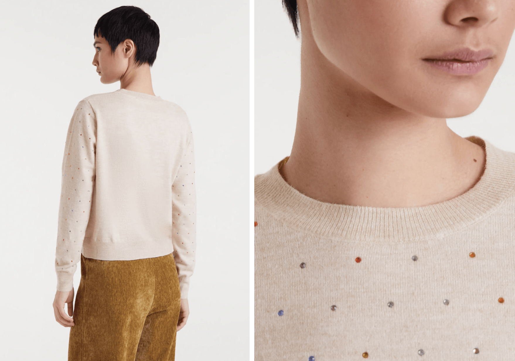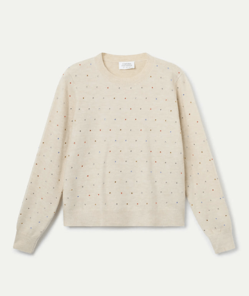 Jersey con tejido punto fino de color beige. Cuello redondo y manga larga. Detalles con aplicaciones brillantes multicolor. Acabados en rib. La modelo mide 177 cm y lleva la talla S.