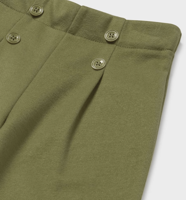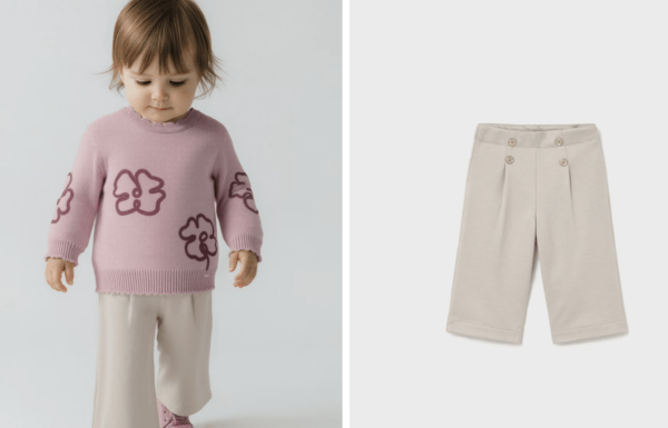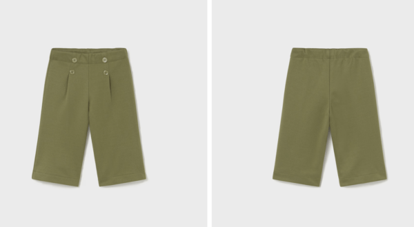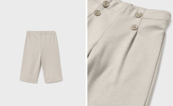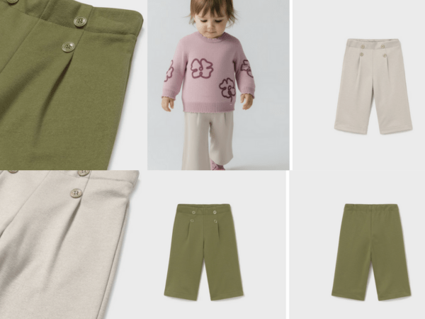 Pantalón para bebé wide leg, ajustado en la cintura y con un corte que se va ensanchando hacia el bajo. Diseño ancho, holgado y muy favorecedor. Cinturilla elástica. Goma elástica regulable con botones en el interior de la cinturilla para mayor ajuste. Cómodo tejido de sarga de gran resistencia.