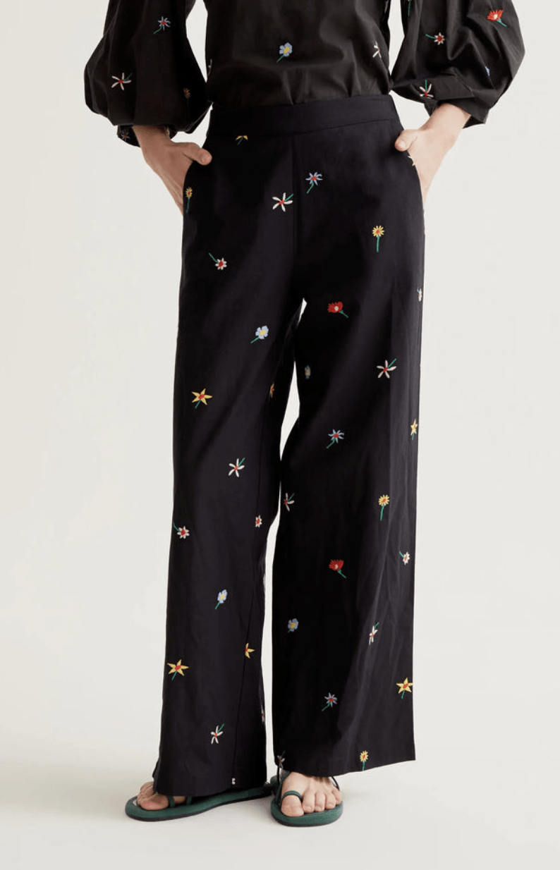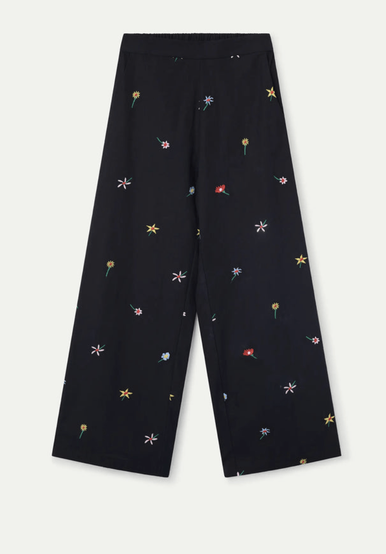 Pantalón de tejido 100% algodón con estampado black gardener flowers. Cintura fija elástica de tiro alto. Pernera recta. La modelo mide 175 cm y lleva la talla S.