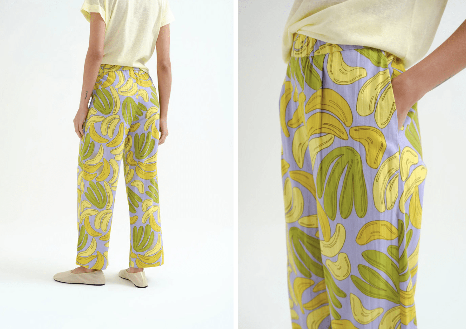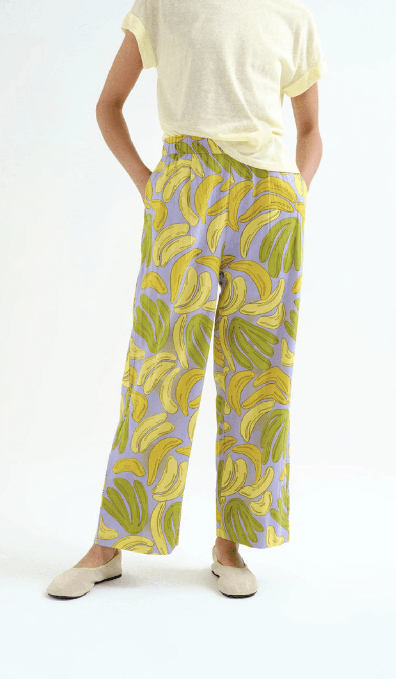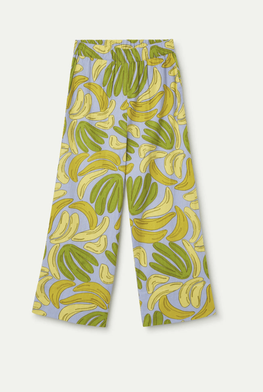 Pantalón de tejido 100% algodón con estampado guineo. Cintura elástica de tiro medio. Pernera recta. Bolsillos laterales. La modelo mide 175 cm y lleva la talla S.