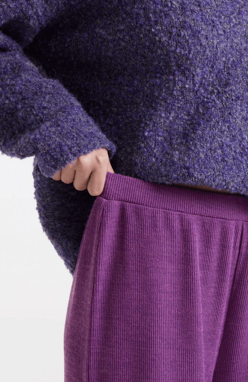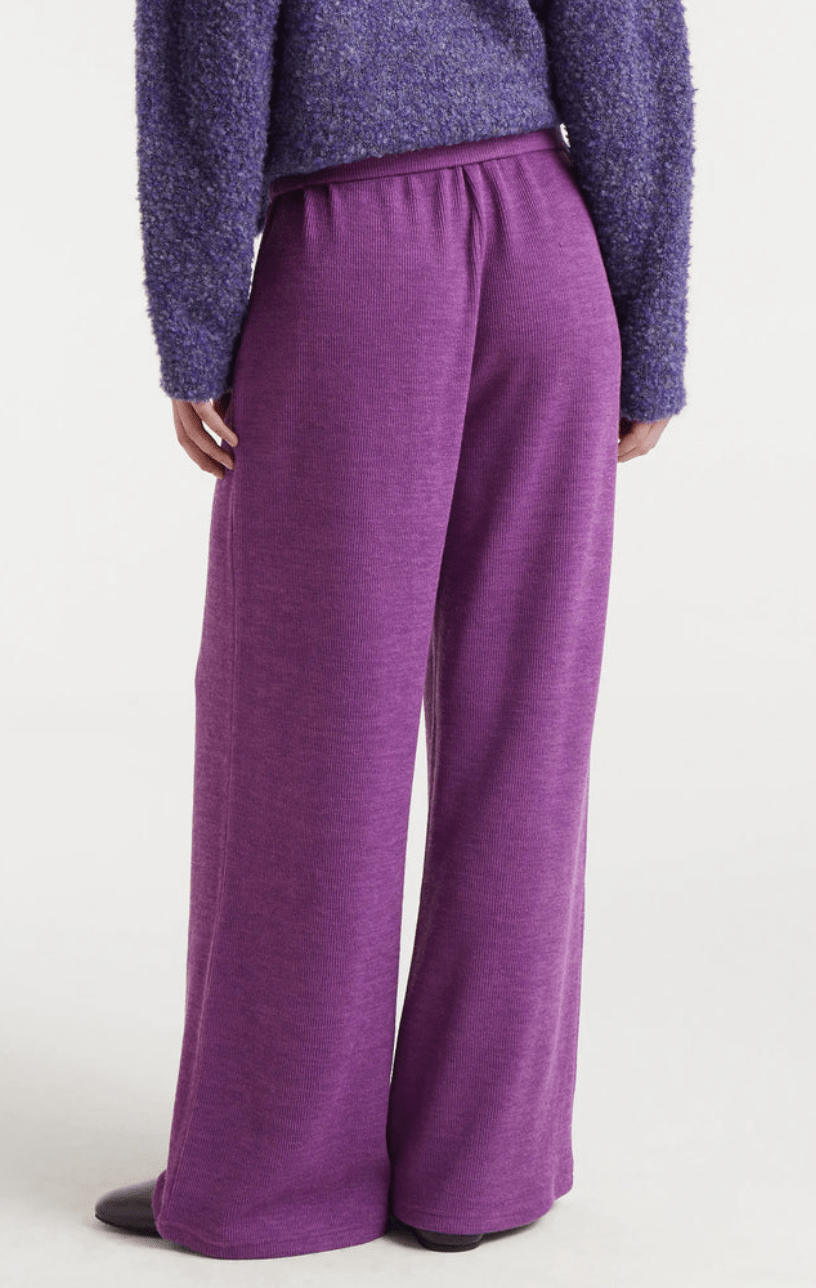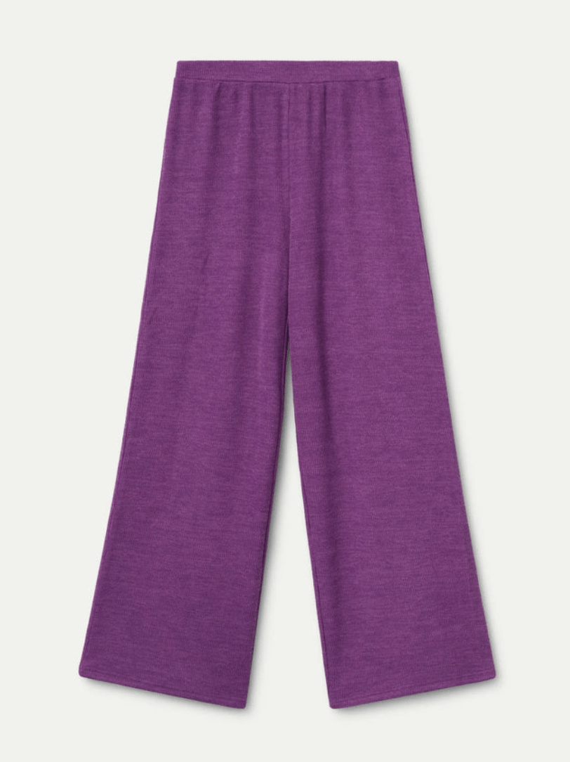 Pantalón con tejido punto canalé de color magenta. Cintura con goma elástica de tiro alto y pernera de corte recto. La modelo mide 175 cm y lleva la talla S.