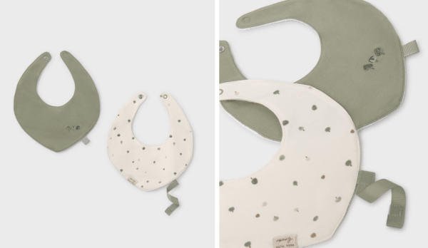 Babero para bebé. Botón a presión en el cuello para facilitar la puesta de la prenda. Este artículo incluye una cinta extraíble para poder incorporar su chupete. Se trata de un artículo de diseño unisex de gran versatilidad por la neutralidad de sus tonos y su forma.