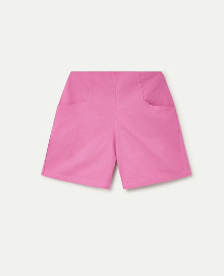 Shorts de tejido 100% algodón de color rosa. Cintura elástica de tiro alto. Bolsillo lateral. La modelo mide 177 cm y lleva la talla S.