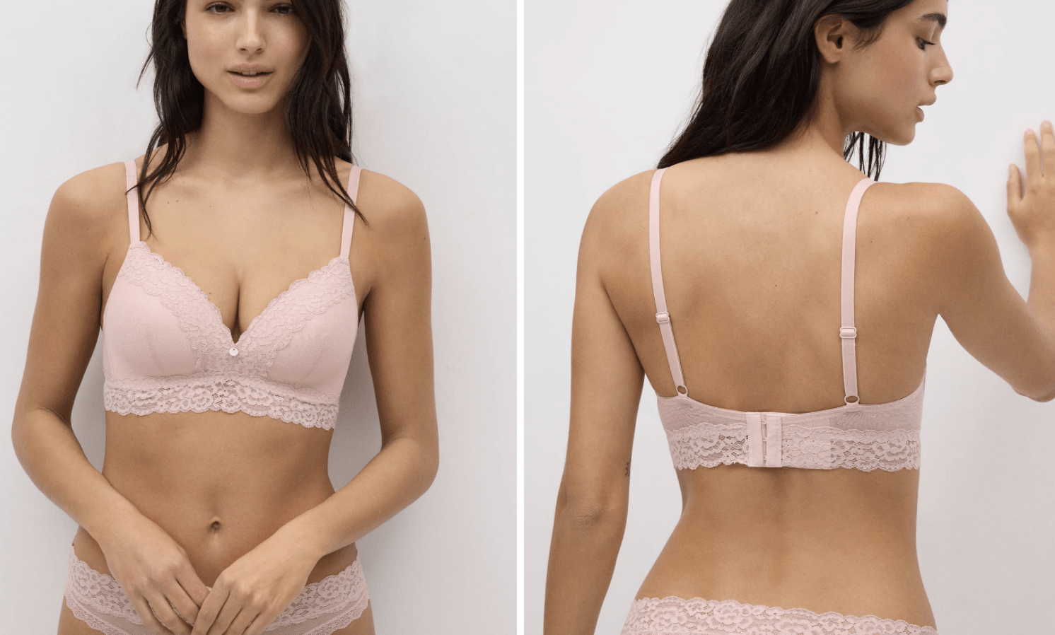 Sujetador sin aro y con relleno. Una única pieza que envuelve la figura en encaje. Combínalo con una braguita de la colección y completa tu look de lencería. Color rosa.