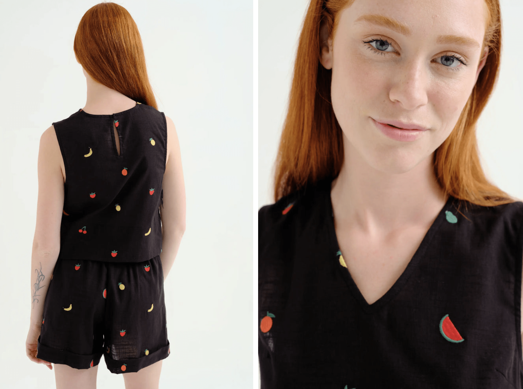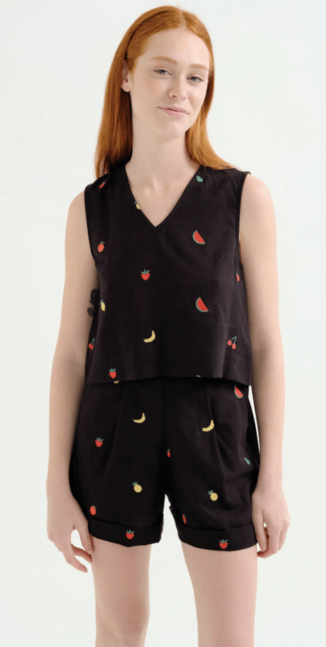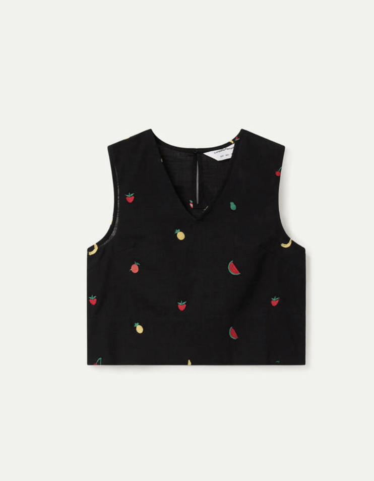 Top de tejido 100% algodón de color negro con bordado de ensalada de frutas. Escote pico y sin mangas. Cierre posterior con botón oculto. La modelo mide 175 cm y lleva la talla S.