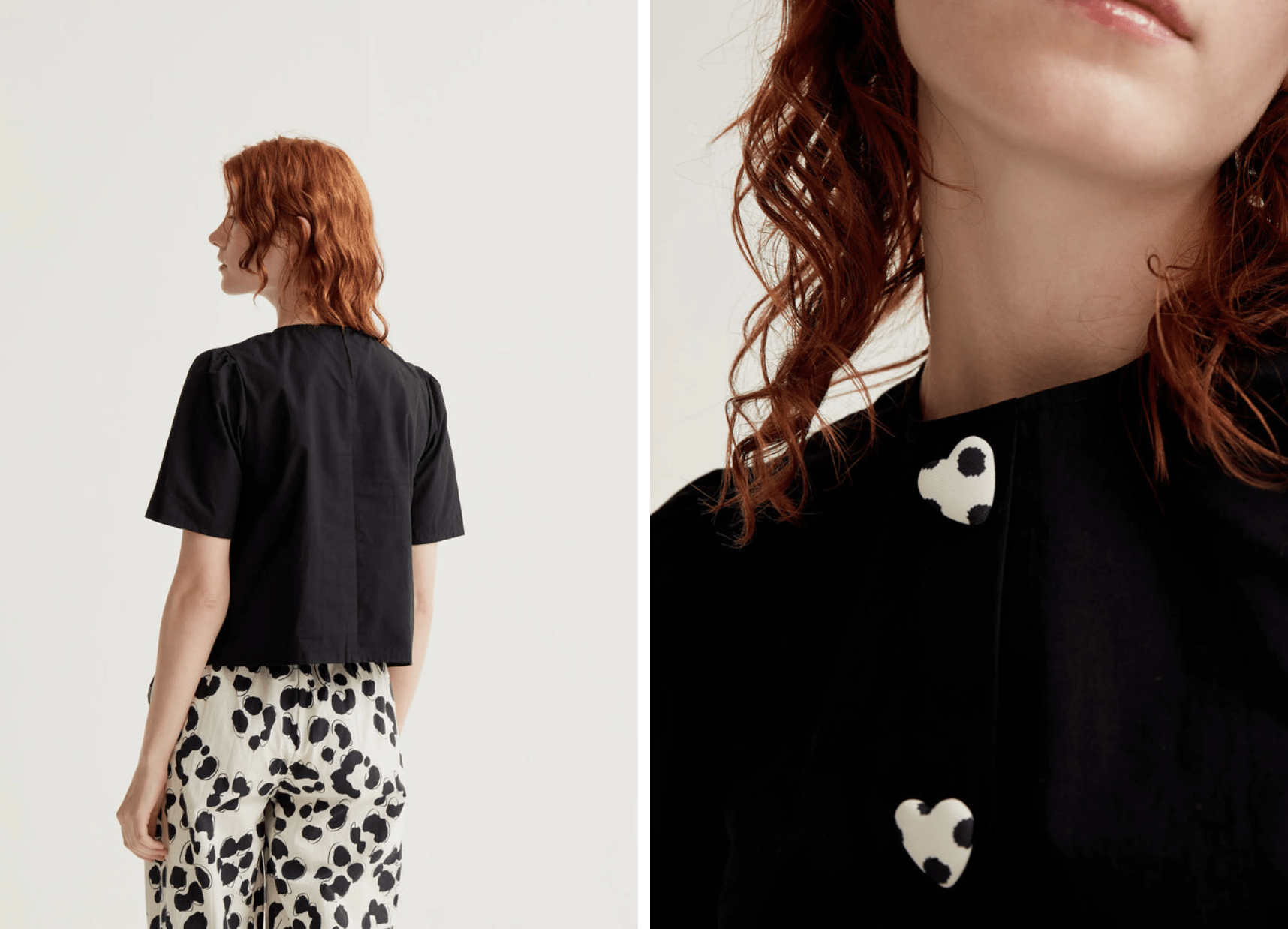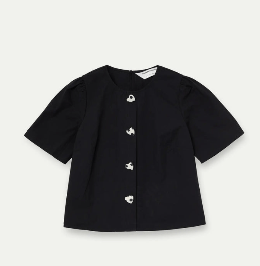Top de tejido 100% algodón de color negro. Cuello redondo y manga corta ligeramente abullonada. Cierre frontal con botones ocultos con detalle de corazón. La modelo mide 175 cm y lleva la talla S.