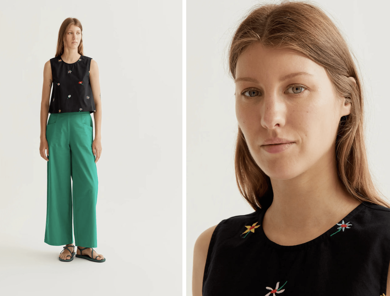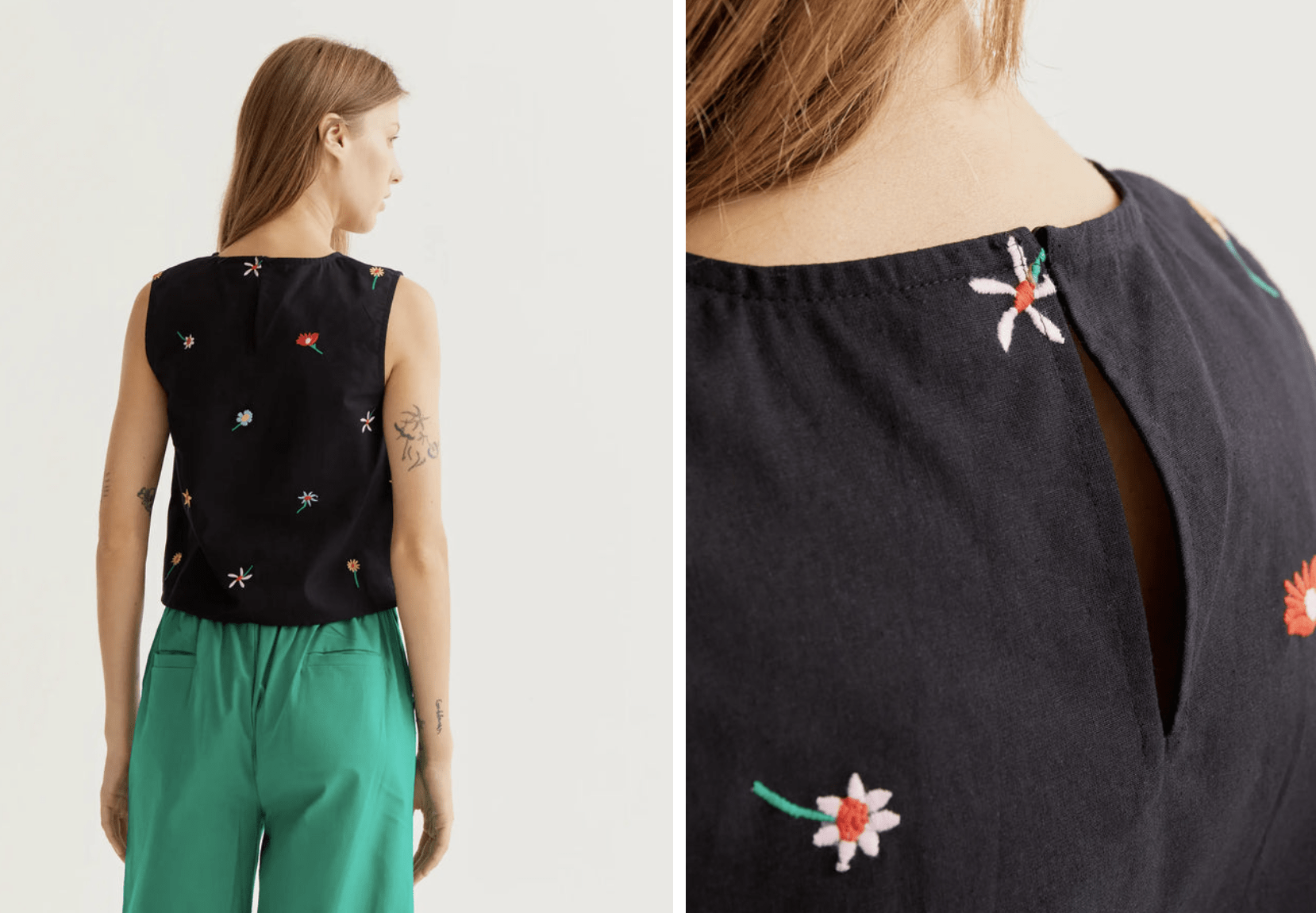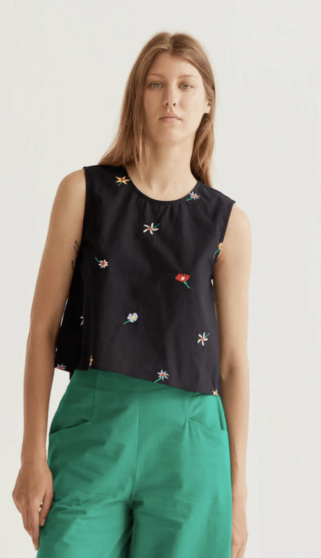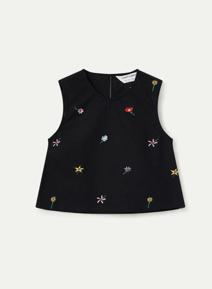 Top de tejido 100% algodón con estampado black gardener flowers. Cuello redondo y sin mangas. Cierre posterior con botón oculto. La modelo mide 177 cm y lleva la talla S.