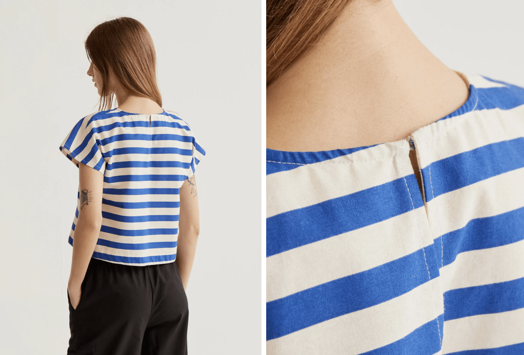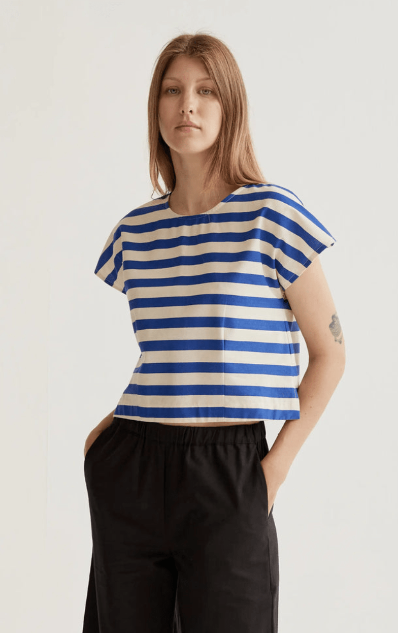 Top de tejido 100% algodón con estampado bamboo blue. Cuello redondo y manga corta. Cierre trasero con botón oculto en escote pico. La modelo mide 177 cm y lleva la talla S.