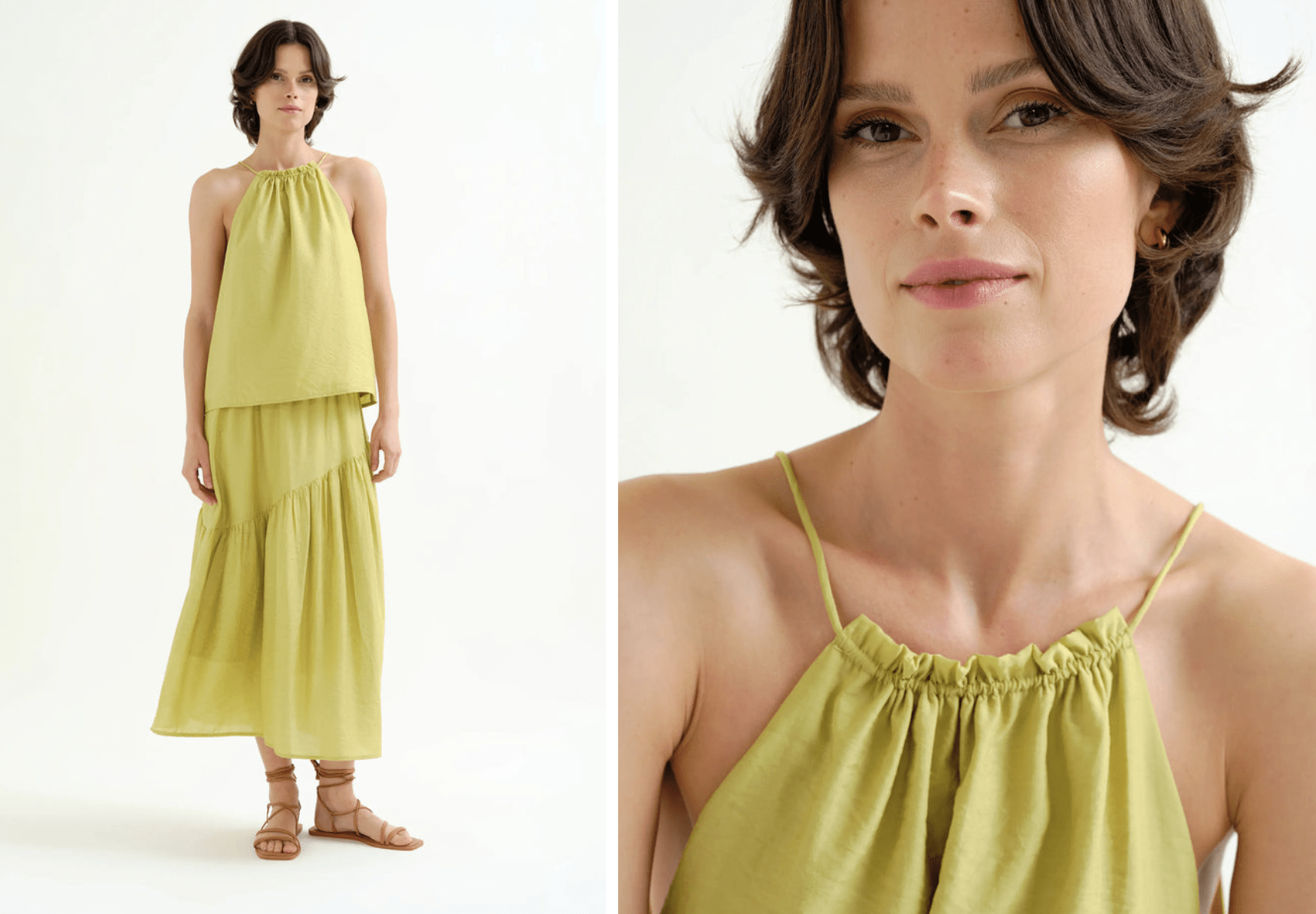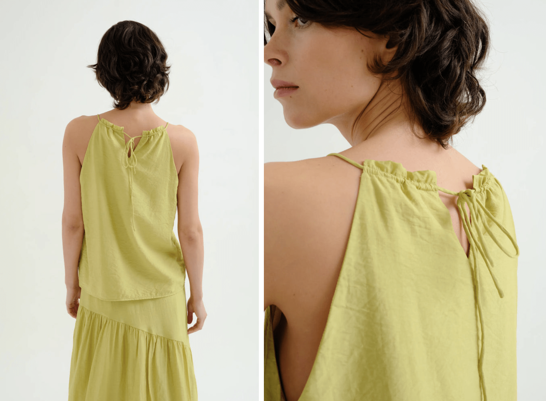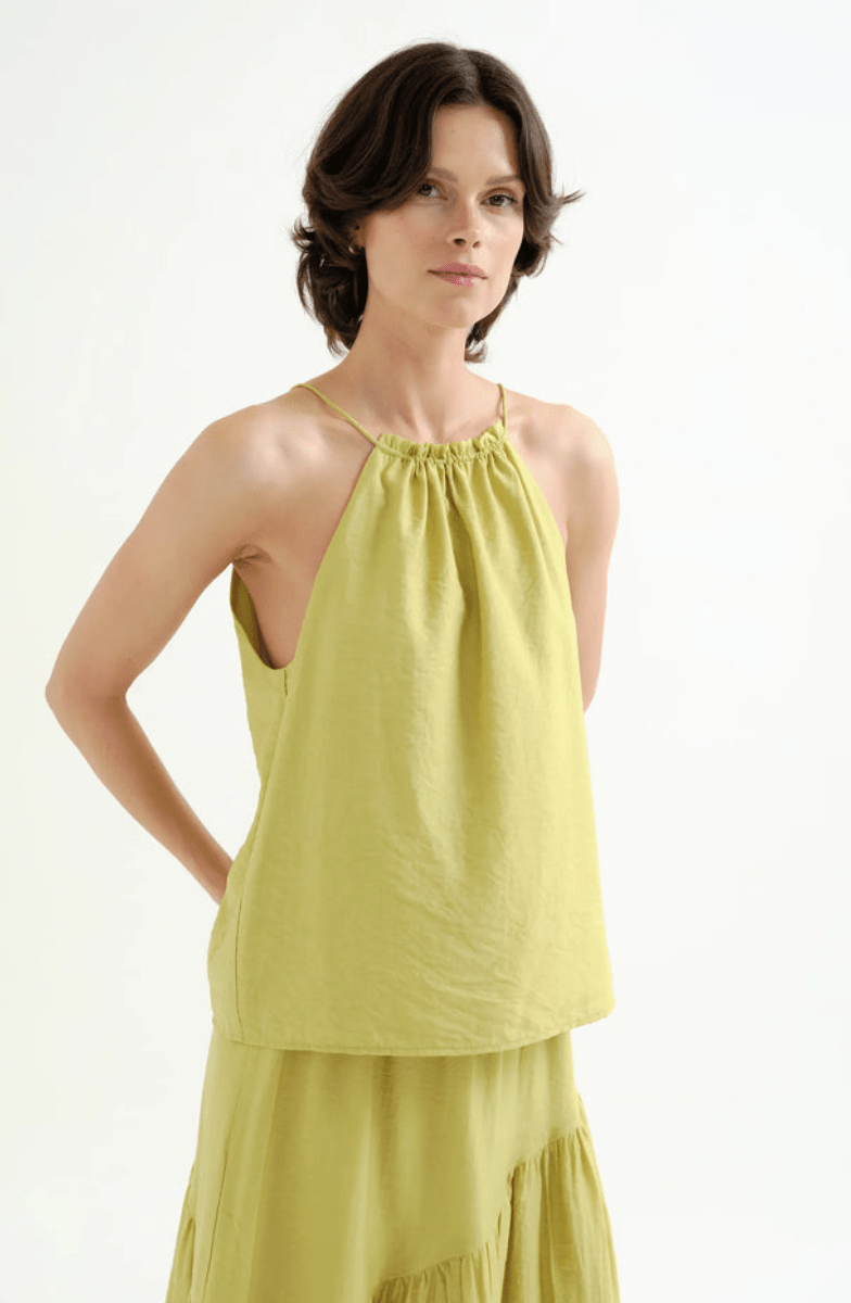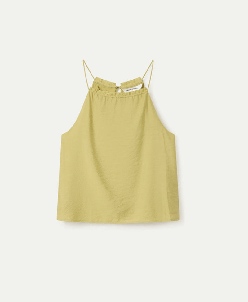 Top de tejido crepe satinado de color verde. Escote halter y sin mangas. Ajuste con cordones en la parte trasera. Forro interior.La modelo mide 177 cm y lleva la talla S.