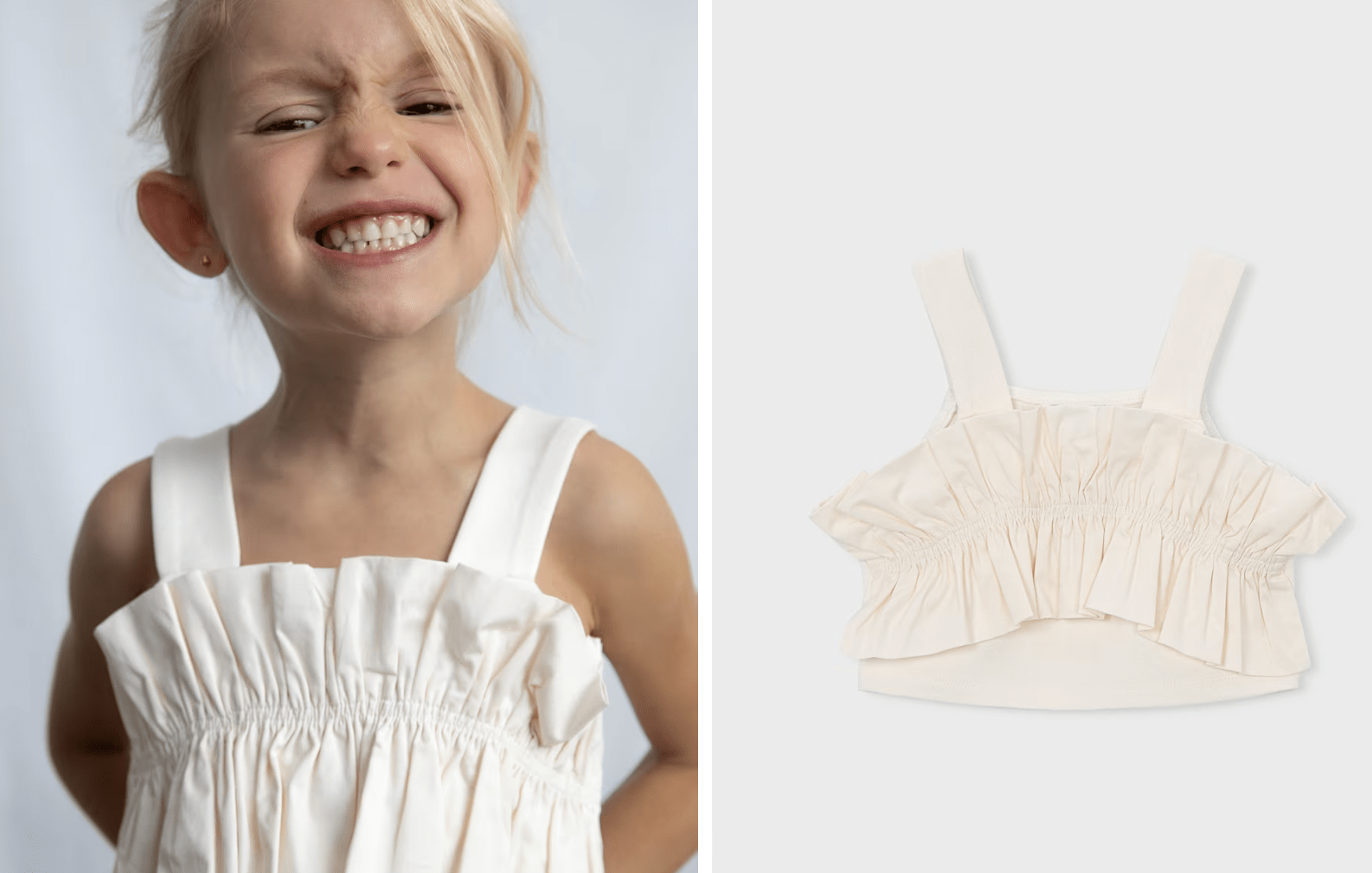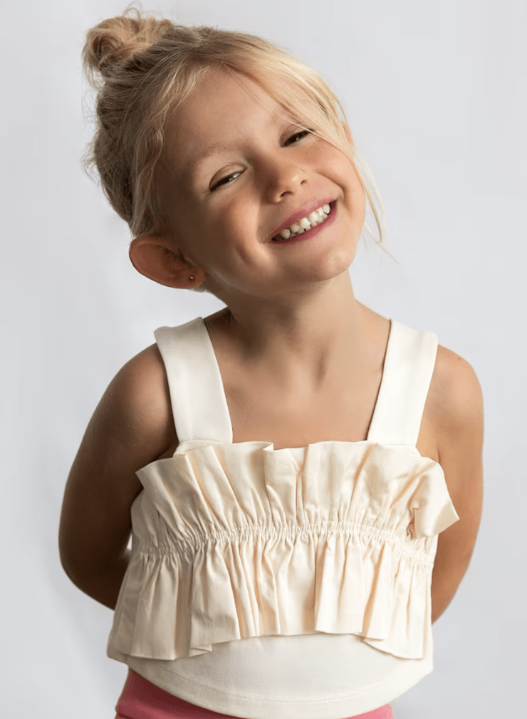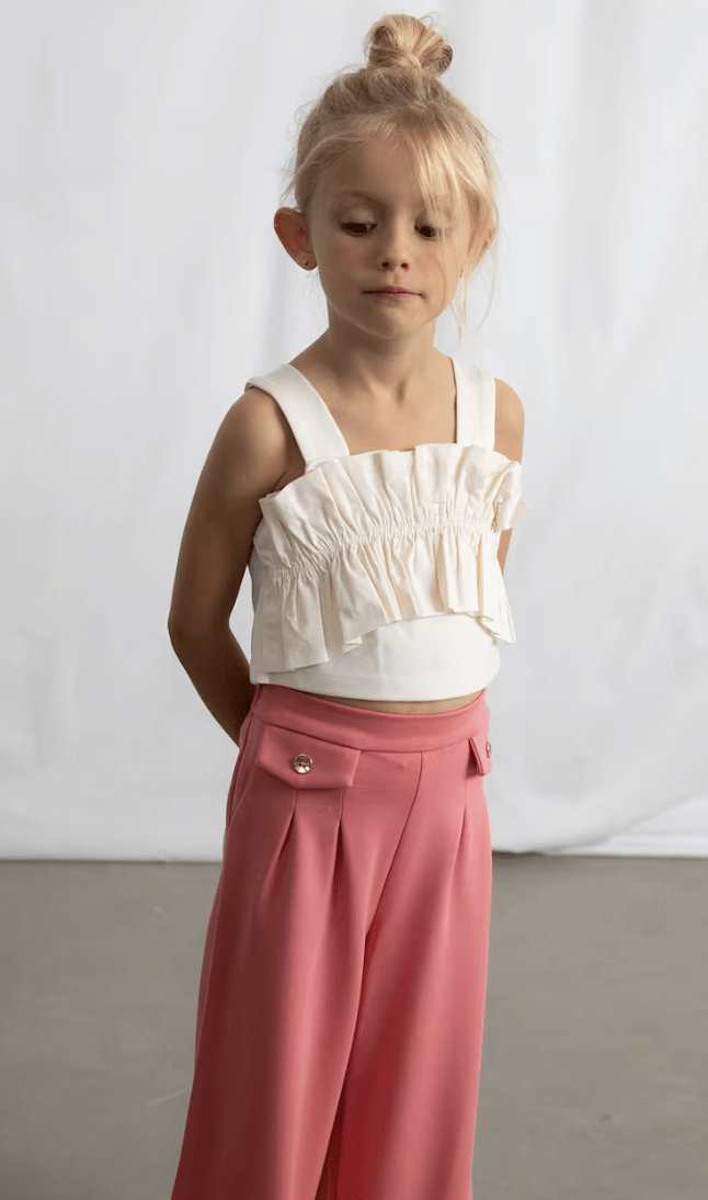 Top para niña. Cuenta con tirantes anchos y un cuello redondo. Incorpora un diseño con volantes en la parte frontal. Diseñado para ocasiones especiales.