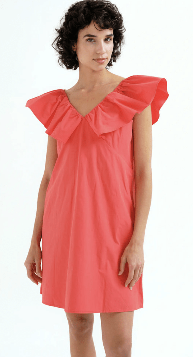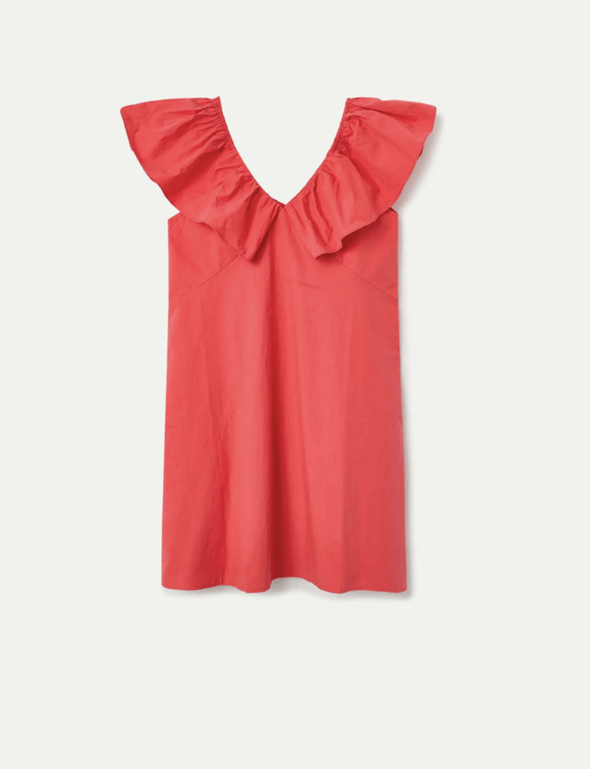 Vestido corto de tejido 100% algodón de color rojo. Escote en pico y sin mangas. Detalle de volante. Forro interior. La modelo mide 175 cm y lleva la talla S.