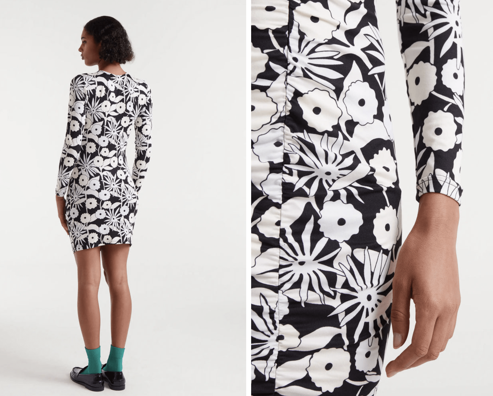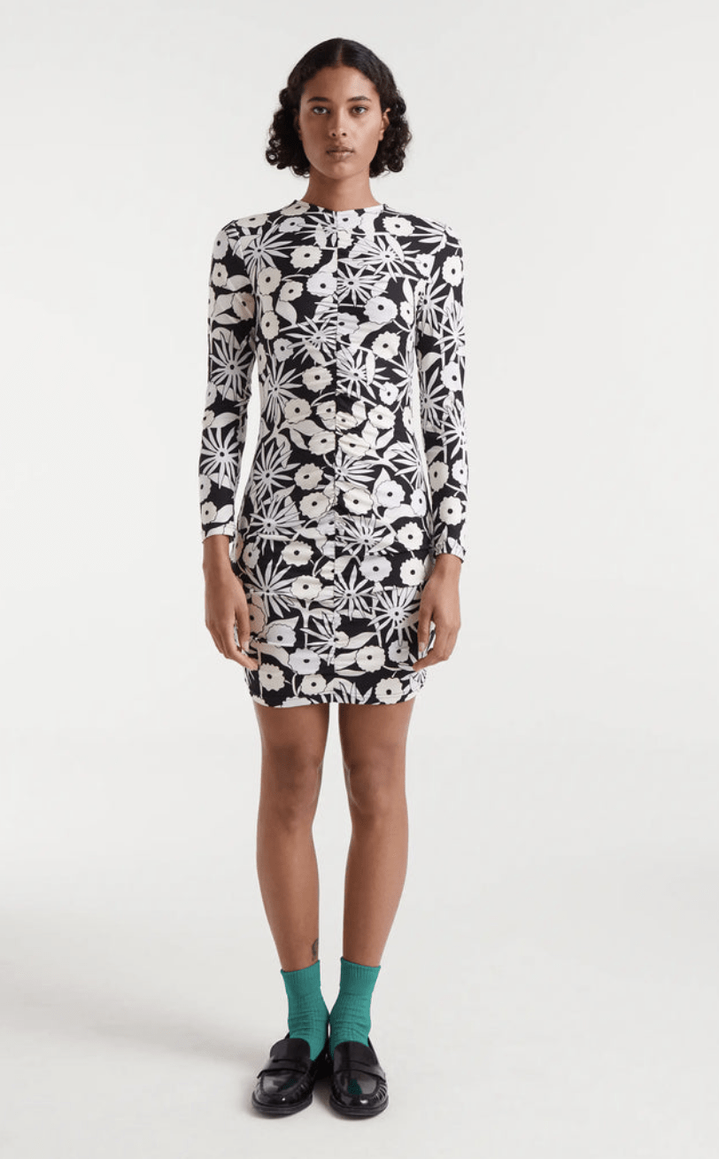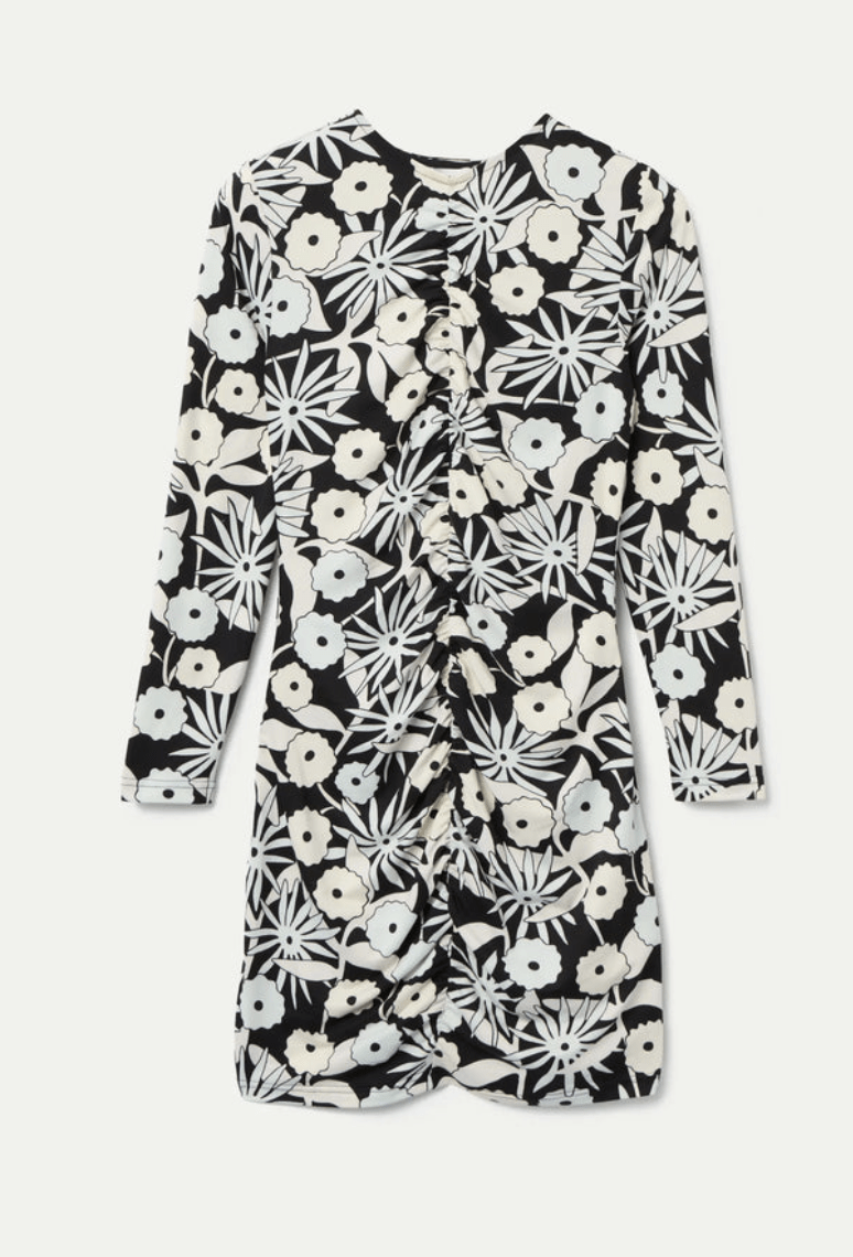 Vestido corto con tejido punto estampado Tofu. Con cuello redondo y manga larga. La modelo mide 175 cm y lleva la talla S.