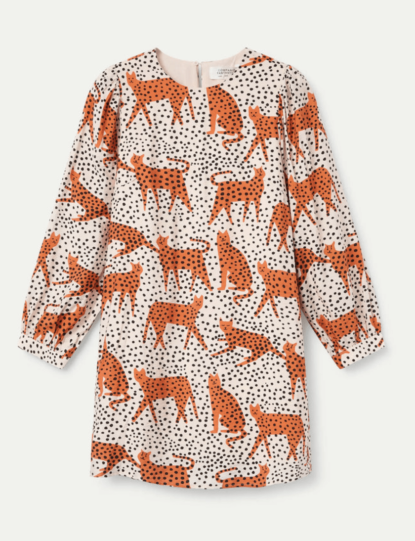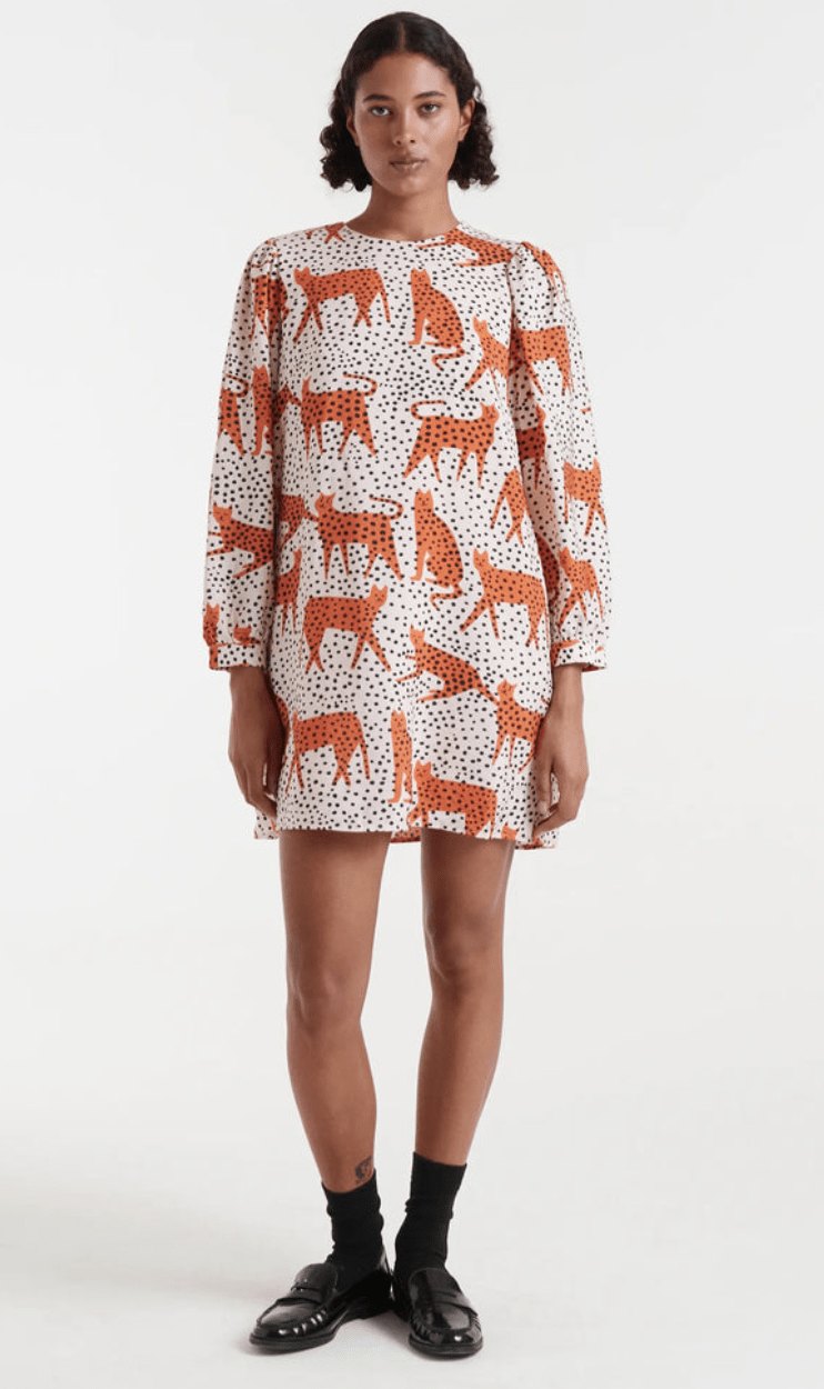 Vestido corto de tejido crepé ligero con estampado Tano. Con cuello redondo y manga larga terminada en puño con botón. Cierre trasero con abertura y botón. Forro interior.La modelo mide 175 cm y lleva la talla S.
