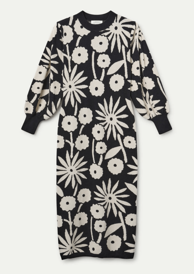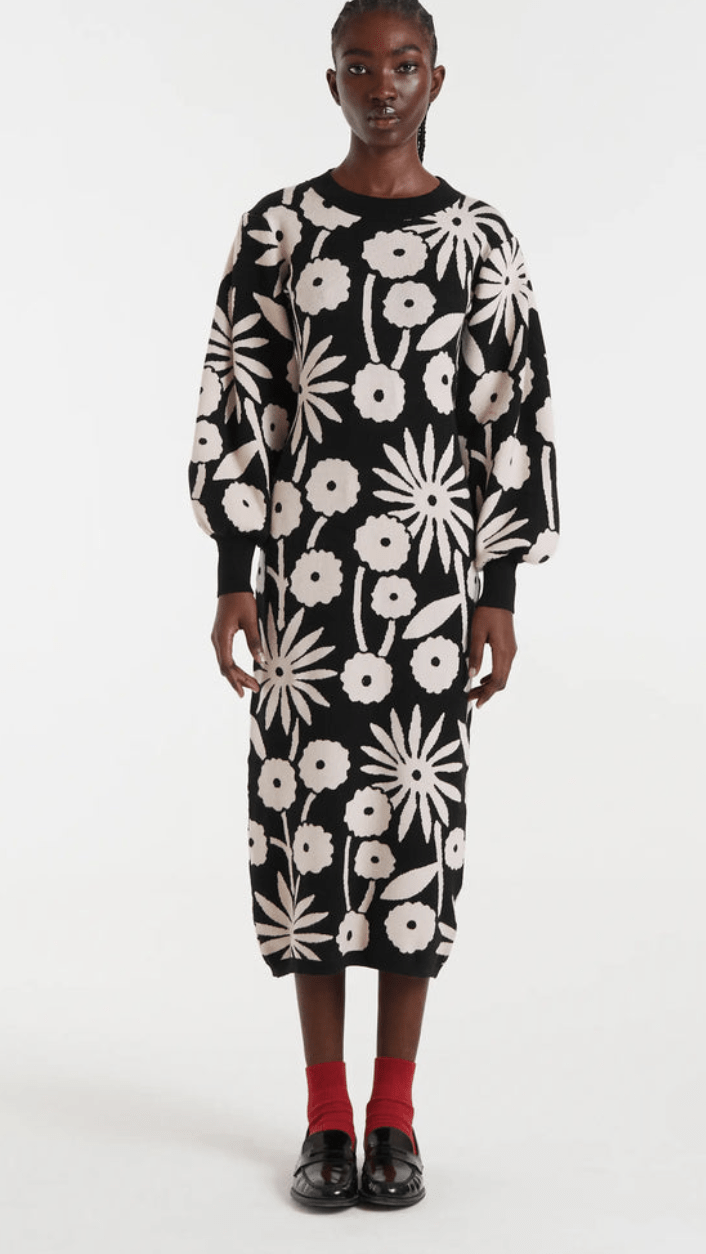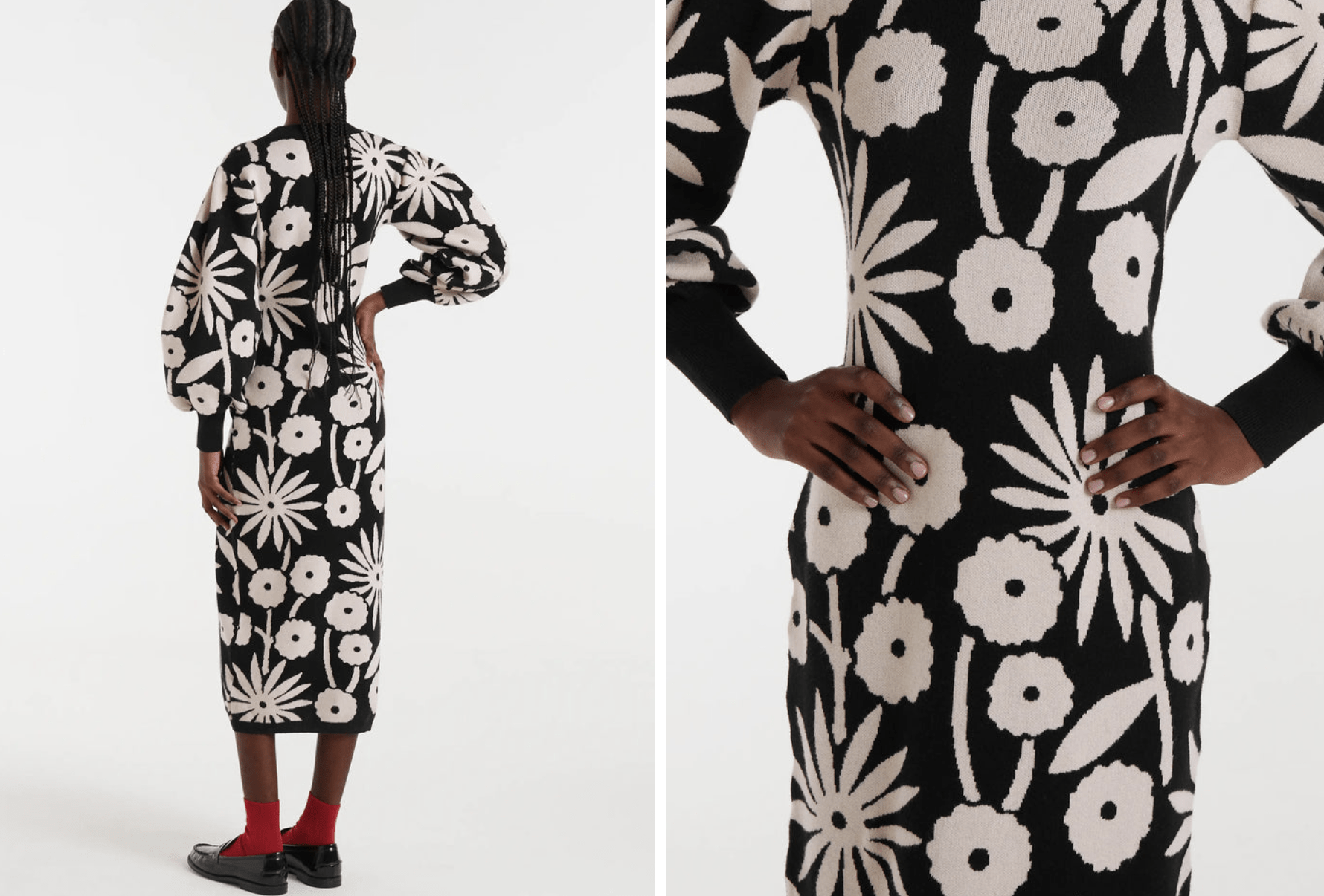 Vestido midi jacquard con estampado Tofu. Con cuello redondo y manga larga abullonada. Detalles en rib. La modelo mide 178 cm y lleva la talla S.