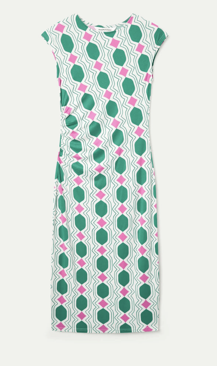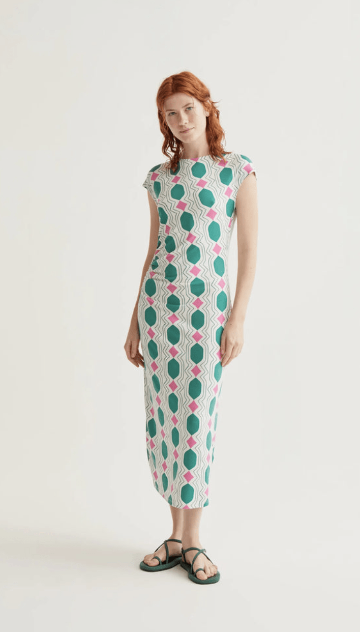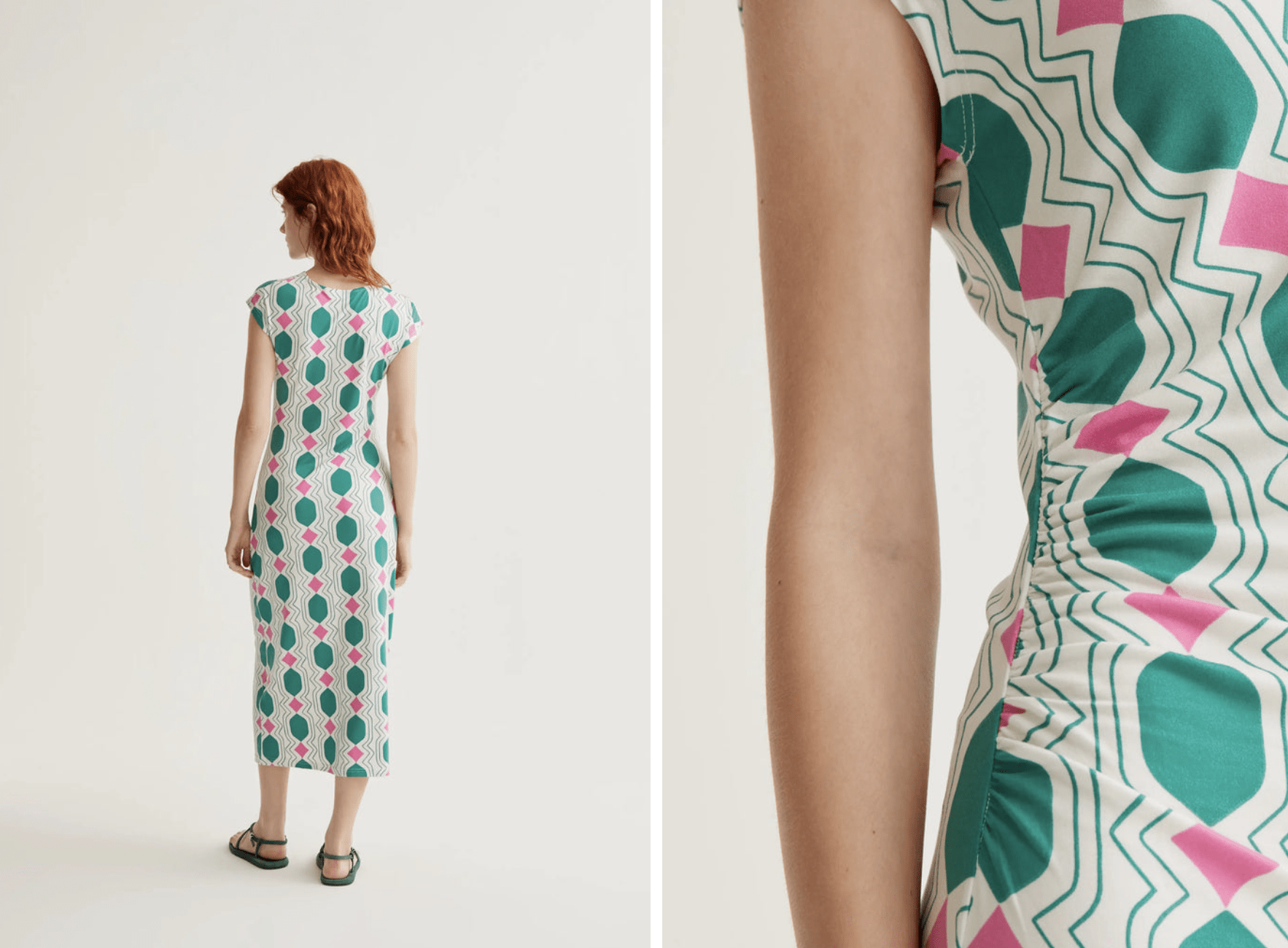 Vestido largo con tejido jersey con estampado geometric. Cuello redondo y sin mangas. Corte ajustado. La modelo mide 175 cm y lleva la talla S.