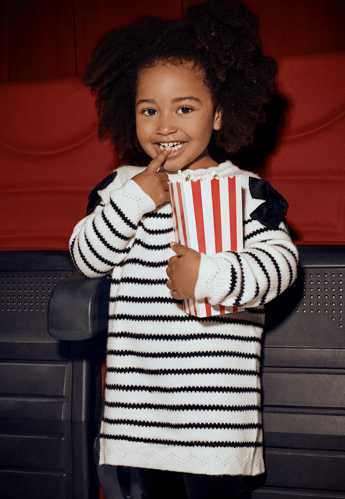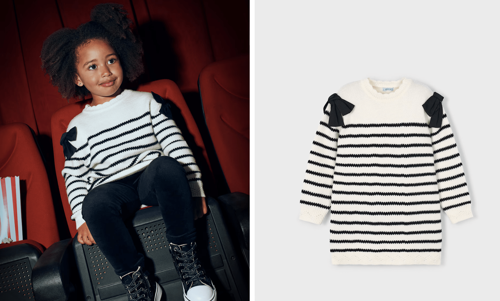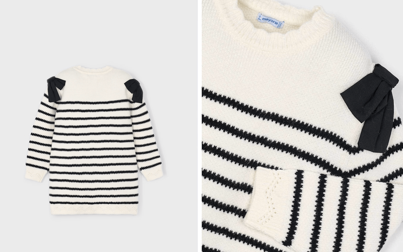 Contiene poliéster reciclado. Vestido de manga larga para niña. Cuello con ondas. Cómodo tejido de punto. Elementos de adorno: apliques de lazos. Motivo de rayas.