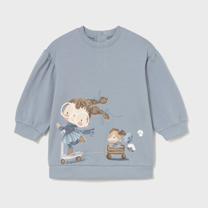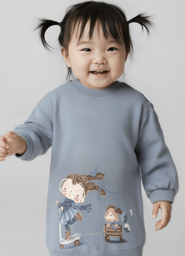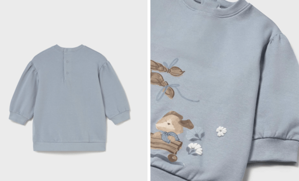 Vestido de manga larga para bebé. Cuello redondo. Cierre con botones a presión en la parte posterior. Cálido tejido de felpa gruesa (felpa perchada), perfecta para los meses fríos. Modelo con rizo. Elementos de adorno: serigrafía (print).