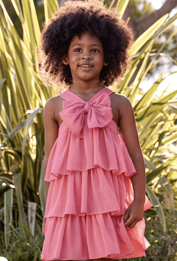 Vestido de tirantes con volantes para niña. Confeccionado en tejido de bambula. Los tirantes son anchos y se cierran en la parte posterior con un lazo decorativo. Incluye forro interior y cremallera trasera invisible. Este exclusivo artículo pertenece a la colección de Ceremonia y ha sido diseñado para celebraciones, eventos y ocasiones especiales. Disponible en la talla desde los 2 a los 10 años.